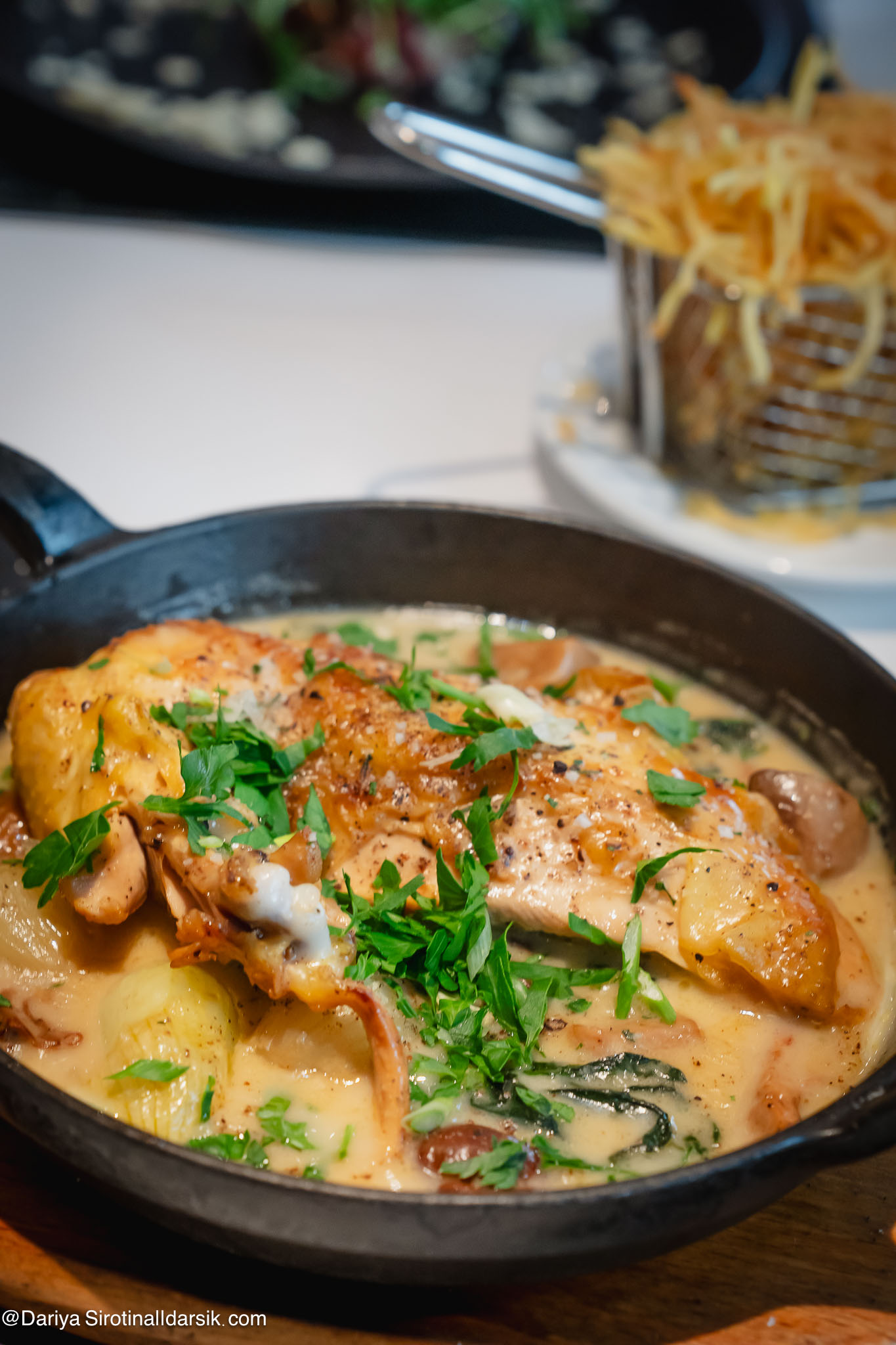 Брассери, работающая с 1910 года и обновленная в 1985. Находится в шаге от Пале Рояль и одного из самых знаменитых пассажей правого берега, пассажа Вивьен. Классический интерьер — мозаичные полы, кожаные диваны, зеркала, тронутые патиной, высокие колонны, стойка темного дерева плюс меню, в котором большой акцент сделан на морепродукты. Однако, самое знаменитое блюдо здесь — половинка курицы, упомянутая как лучшая курица в мире в фильме Somethings Gotta Give, в русском прокате, — «Любовь по правилам и без», известном настолько, что его смотрела, по-моему, даже я. Попробовали мы эту курицу. Хорошая, как у бабушки. Ну или у дедушки! Однако, судя по отзывам в сети, многие оказываются этой курицей разочарованы. Мол, курица как курица. В этом, на самом деле, и кроется суть (или одна из сутей) французской кухни. Она выводит на первый план продукт. Не технику, не подачу, а продукт.