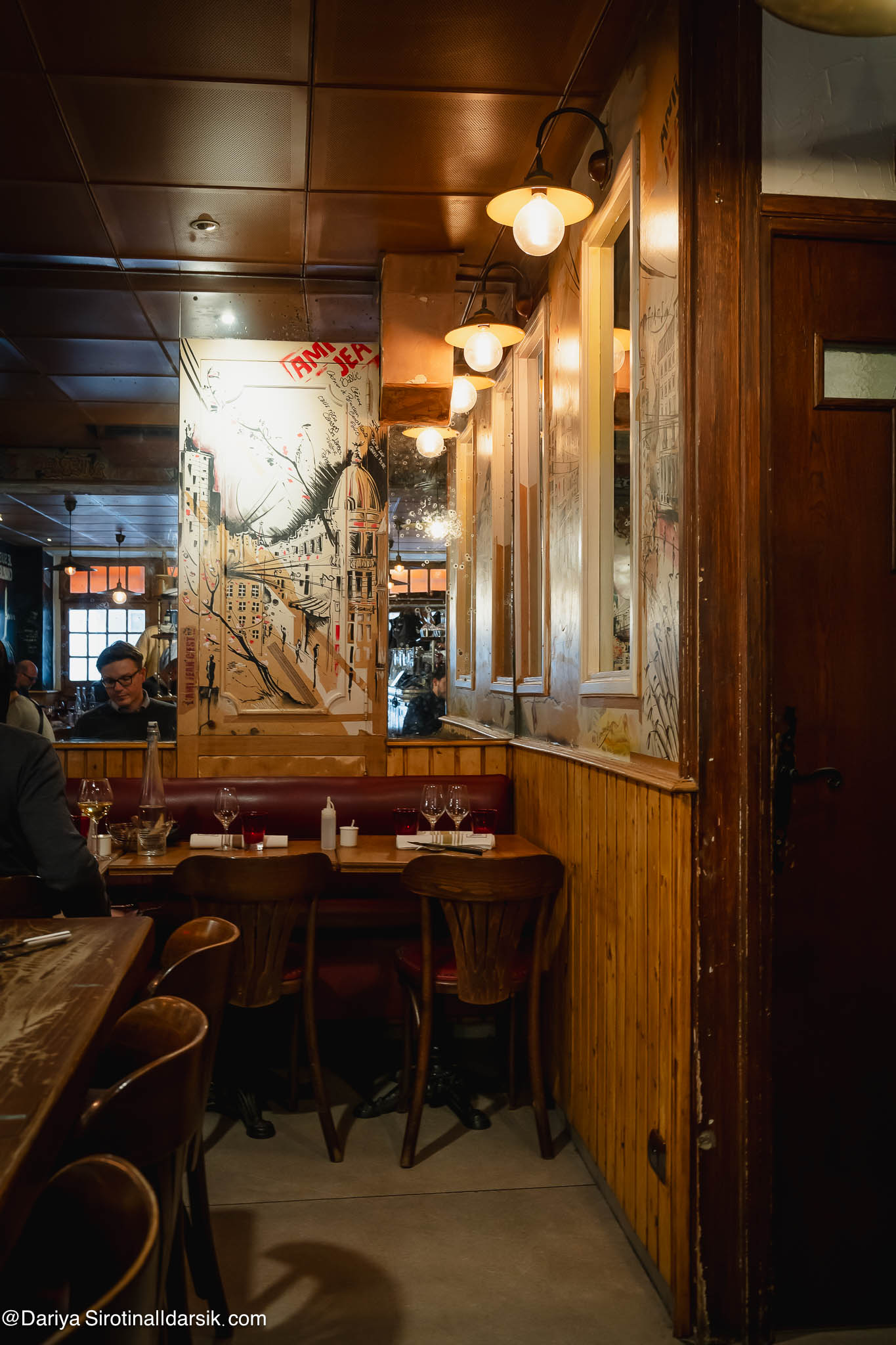 Говорят, что это одно из самых красивых бистро Парижа! Глядя на украшенные мозаикой стены, росписи с изображением героев Эдмона Ростана (бистро названо в честь героя пьесы Ростана «Сирано де Бержерак»), тронутые патиной зеркала и причудливые светильники, в это охотно веришь. Расположено бистро там, куда, например, из Марэ, отданного давно туристам, еще сильно до ковида съехал центр современного, молодого и продвинутого Парижа — в окрестностях бульвара Клиши. Туристы тут все еще почти не водятся, зато по собравшейся публике понятно, что большая часть из них — завсегдатаи.