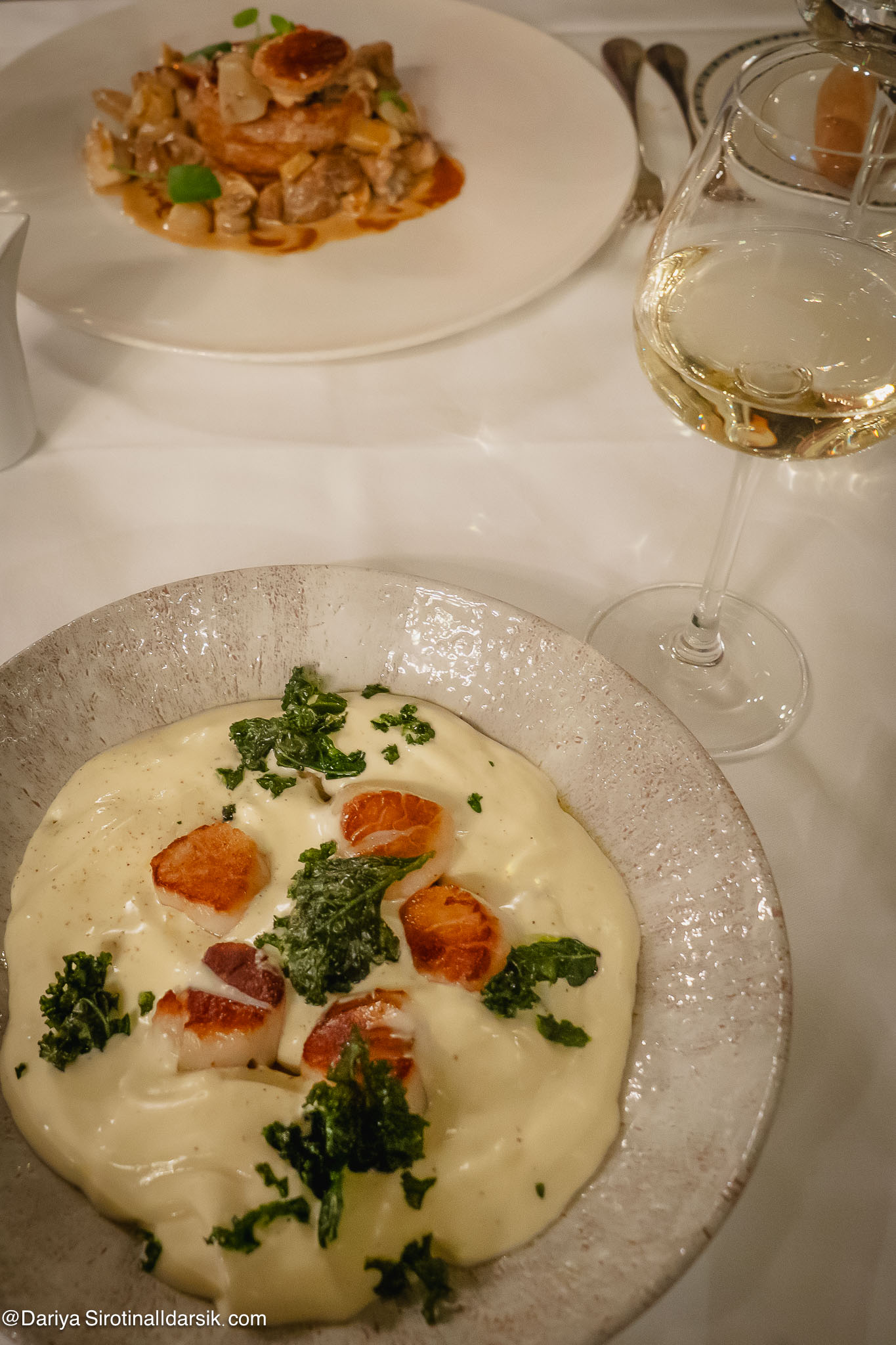 Ресторан находится в нетуристическом шестнадцатом округе в дивной красоты особняке. В Alain Ducasse Baccarat невероятной прелести посуда — естественно, Baccarat, и прекрасный выбор шампанского по бокалам. Меня очень порадовала не только кухня, но и быстрота, с которой сервируют довольно длинное меню. Многие подачи представляют собой два блюда сразу или блюдо и его дополнение, поданные вместе. В Alain Ducasse Baccarat — а это ресторан повышенной рентабельности, так скажем — у шефа нет никакого желания использовать, оправдывая цену, самые дорогие ингредиенты. То есть ни лобстеров, ни черной икры, ни съедобного золота тут не подают — и слава богу. Ингредиенты ради ингредиентов — это на развивающихся рынках. В Париже в такое не играют. В обед доступно несколько вариантов обедов, например, три подачи за 90 евро.
