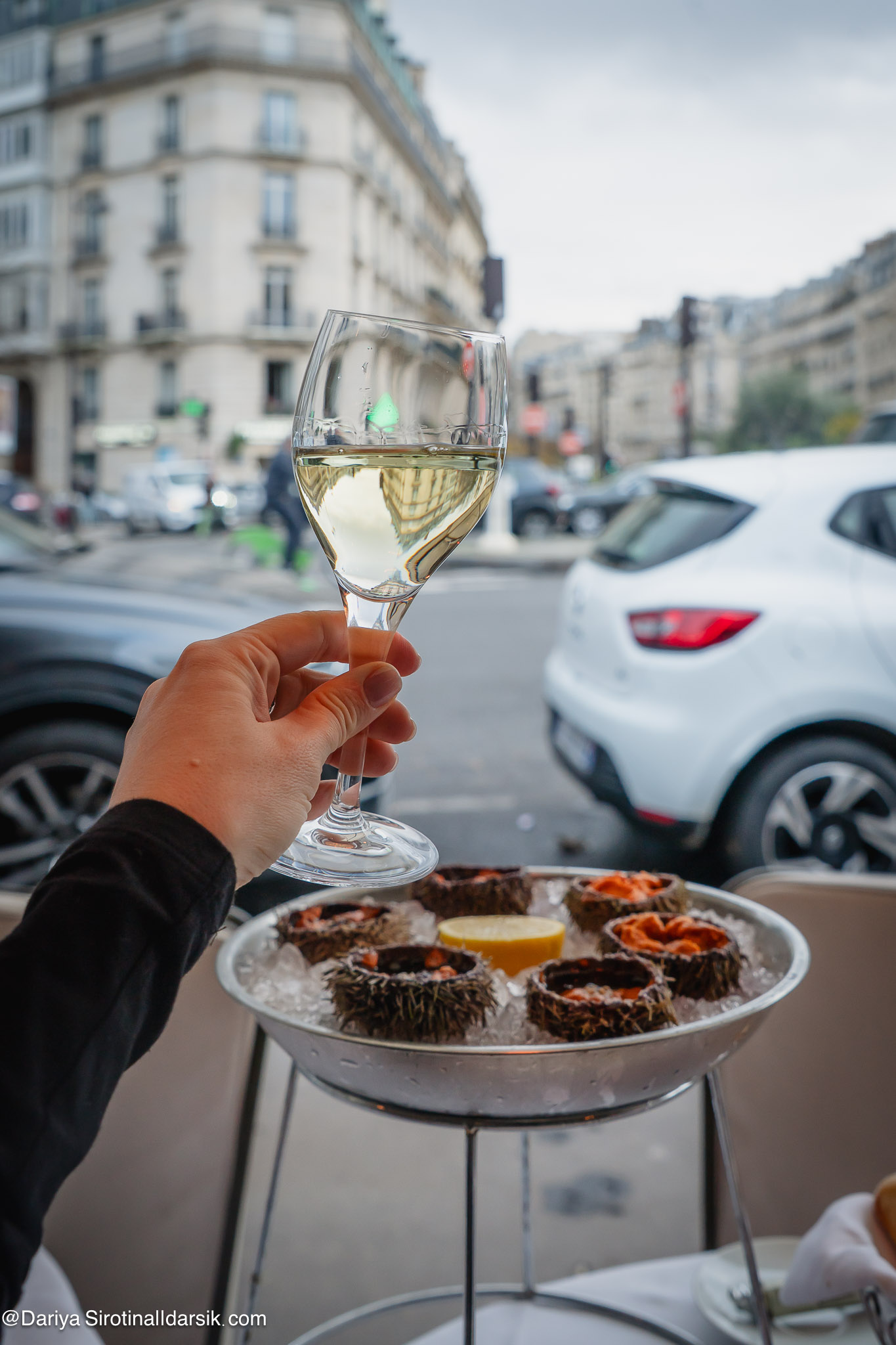 Шестнадцатый округ я знаю плохо — здесь, в окружении роскошных особняков, посольств и самой дорогой в Париже недвижимости делать туристу в целом нечего, если только он не идет пешком из фонда Louis Vuitton в музей Мармоттан-Моне. Так и мы шли с мужем как-то, время было уже обеденное, впечатления от выставки Шарлотты Периан надо было чем-то запить. И тут на выходе буквально со станции метро я увидела бистро, которое оказалось парижской институцией, местом заседания Алена Делона, телевизионщиков, женщин с шанелями, мужчин с сигарами. Это был чудесный декабрьский ланч на террасе — вино, устрицы, морские ежи, хрустящий хлеб, соленое масло и много, очень много наблюдения за людьми, которые имеют деньги, но не имеют желания произвести впечатление. Помните, Николя Саркози в тюрьме сидел целых пару недель и успел там книгу написать? Обмывал он вновь обретенную свободу тут, а не в вечном Le Fouquet на Елисейских полях.