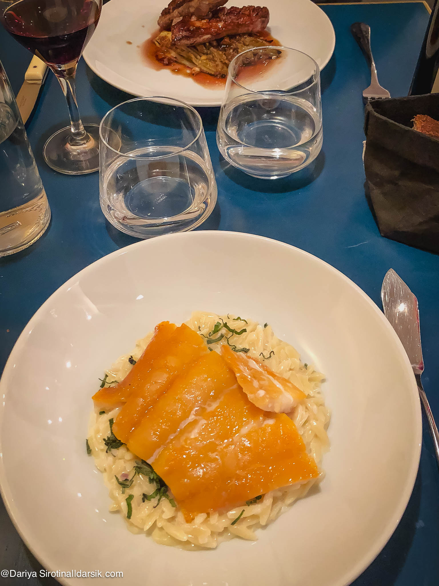 Ресторан трехвездочного шефа Нико Ромито в отеле Bvlgari Dubai ожидаемо хорош. Нас им не удивить, потому что, думаю, вы можете себе представить, сколько раз мы были в таком же ресторане в Дубае (подсказка — многократно). Бар великолепен, что тоже неудивительно. Он очень оживлен вечерами, коктейли классные (и не такие, как в Дубае), люди вокруг самые разные и интересные. Я люблю сюда приходить, даже если не останавливаюсь в Bvlgari, из-за атмосферы и сервиса.