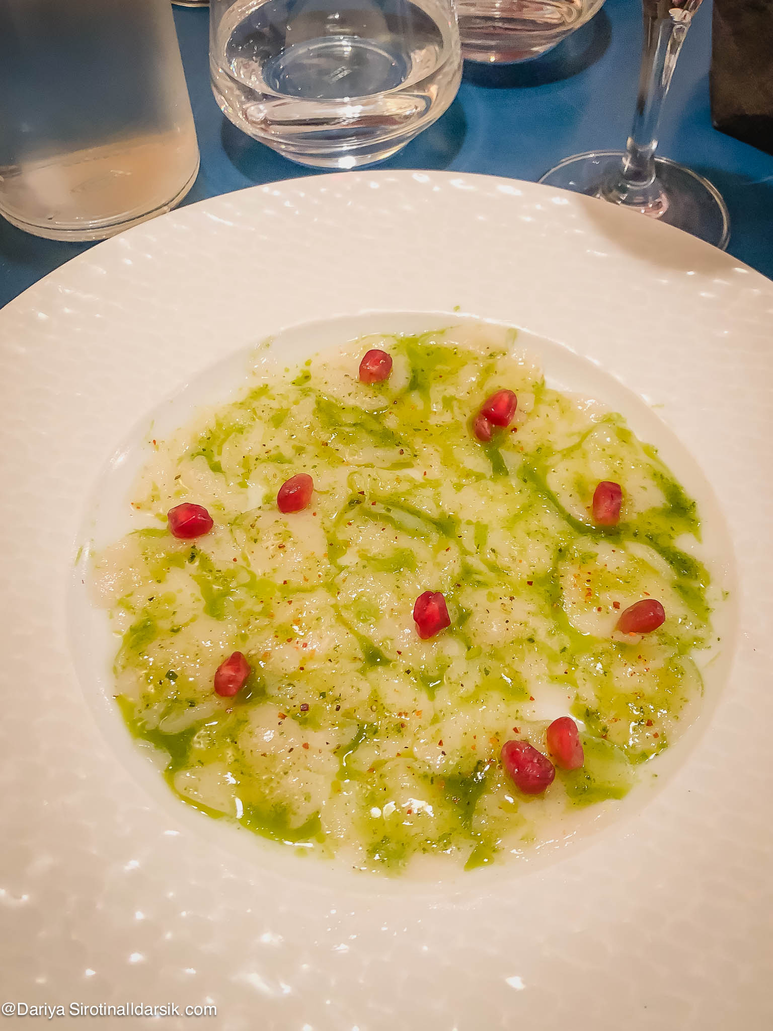 Это мой самый любимый ресторан, единственные парижские три звезды, в которые мы возвращаемся годами. Лучше даже будет сказать — куда мы возвращаемся второе десятилетие, ха-ха. Epicure много лет возглавлял великий Эрик Фрешон, но еще в конце позапрошлого года он ушел. На кухне теперь Арно Фай. Уже год назад я писала, что меню полностью изменилось. Теперь же ресторан обновлен целиком! Изменились текстиль и декор, бабочки Baccarat со столов упорхнули, вместо них — живые цветы. Новая посуда — с гранатами, будто специально для меня — сделана для Epicure фарфоровых дел мастерами Pinto. Вкусы стали легче, заметно кислее. Насыщенная сливочность, чуть, может быть, старомодная французскость Фрешона сменилась осязаемой свежестью. В ресторане новый кондитер, меню с десертами невероятно фантазийное, но сил на сладкое не было. Каждая деталь нового Epicure — от штор и скатертей до винной карты и меню — транслирует идею обновления.