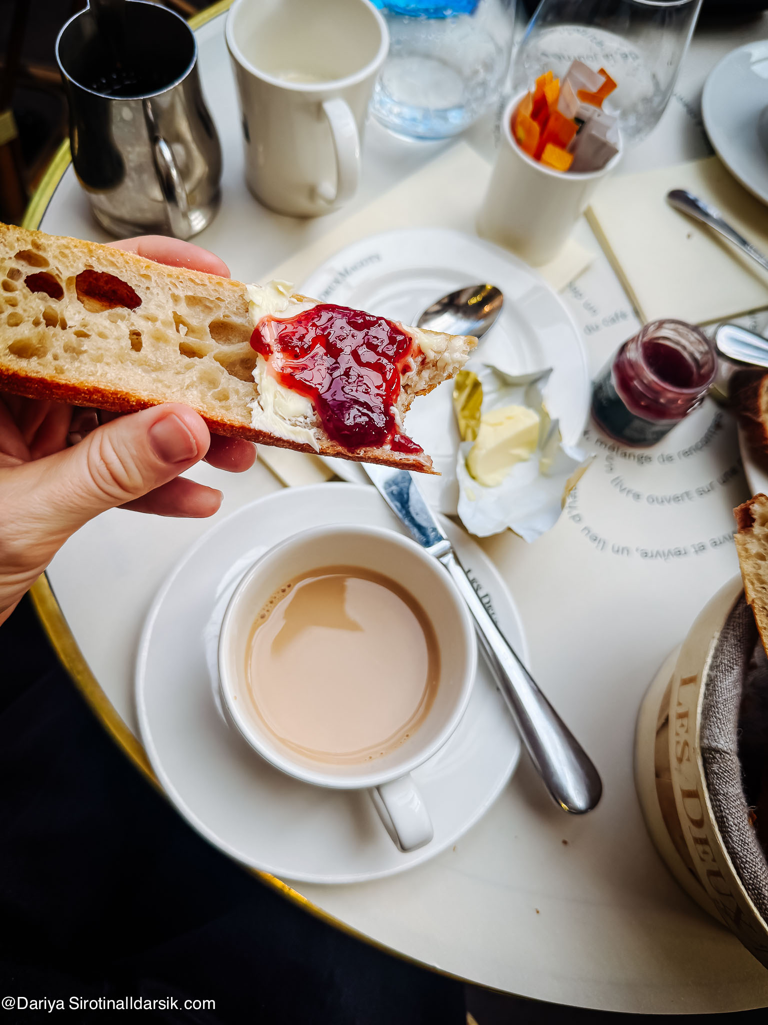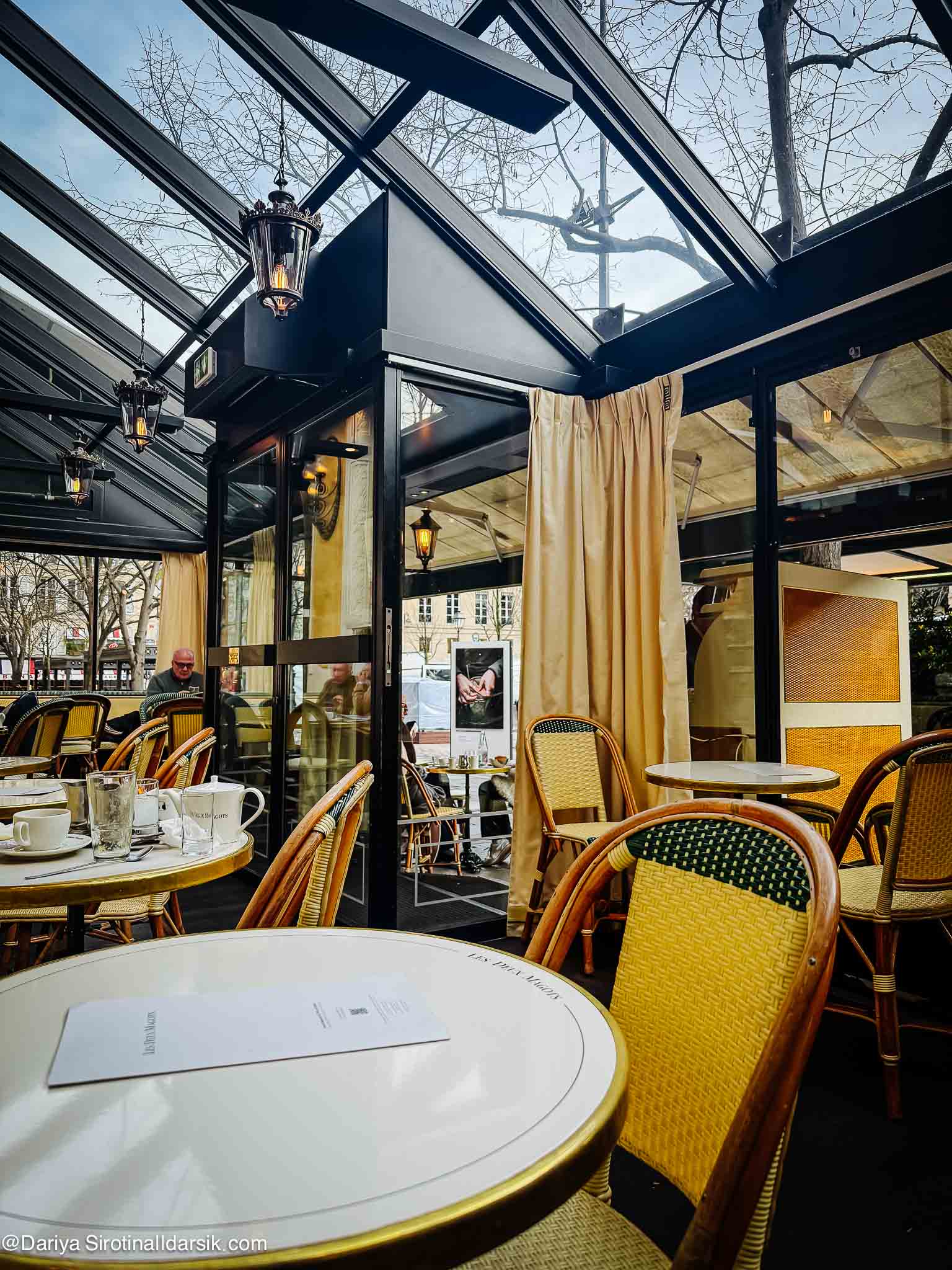 Легендарное литературное кафе на бульваре Сен-Жермен. Тут заседали художники, писатели и прочие интеллектуалы — и продолжают заседать, как и туристы, и сами парижане. Я обычно прихожу на завтрак: не могу устоять перед тартином, сливочным чуть соленым маслом, джемом и кофе с молоком. В последнюю поездку мы жили совсем рядом, а потому приходили почти каждое утро. И я смогла убедиться, что за столиками собираются во многом одни и те же люди, очевидно, приходящие сюда не первый десяток лет. Les Deux Magots работает с раннего утра до позднего вечера без перерыва, так что если вами после концерта, например, овладело желание пропустить стаканчик вина, приезжайте смело, столик вполне может и найтись.