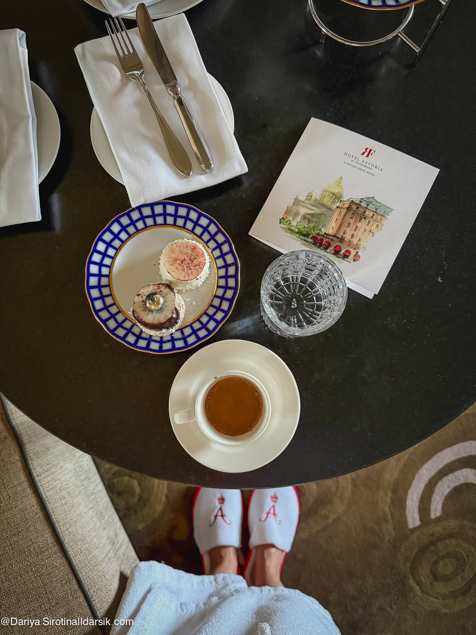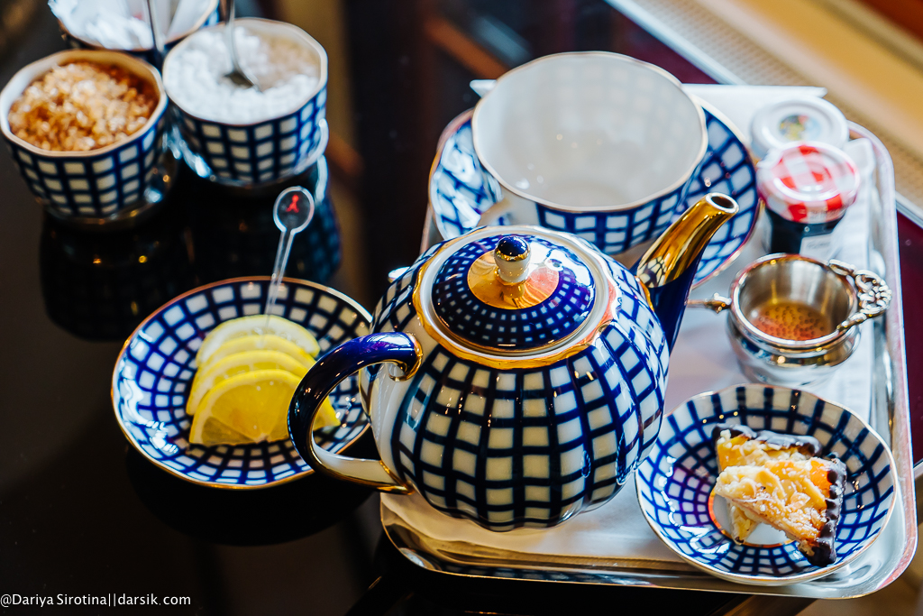 Думаю, пора вернуться в отель, чтобы чуть отдохнуть, переварить впечатления и выпить чаю! Чай в лобби отеля «Астория» подают каждый день с 15 до 18 часов. Звучит живая фортепианная музыка, льется чай в тонкостенные фарфоровые чашки ЛФЗ, манят пирожные, сэндвичи и конфеты ручной работы. Вариантов несколько: это может быть классическая русская церемония с блинами, английский вариант с пирожными и сэндвичами, чай и дегустация икры, диетическая программа. Если вы улетаете этим вечером, такое чаепитие заменит вам ужин.