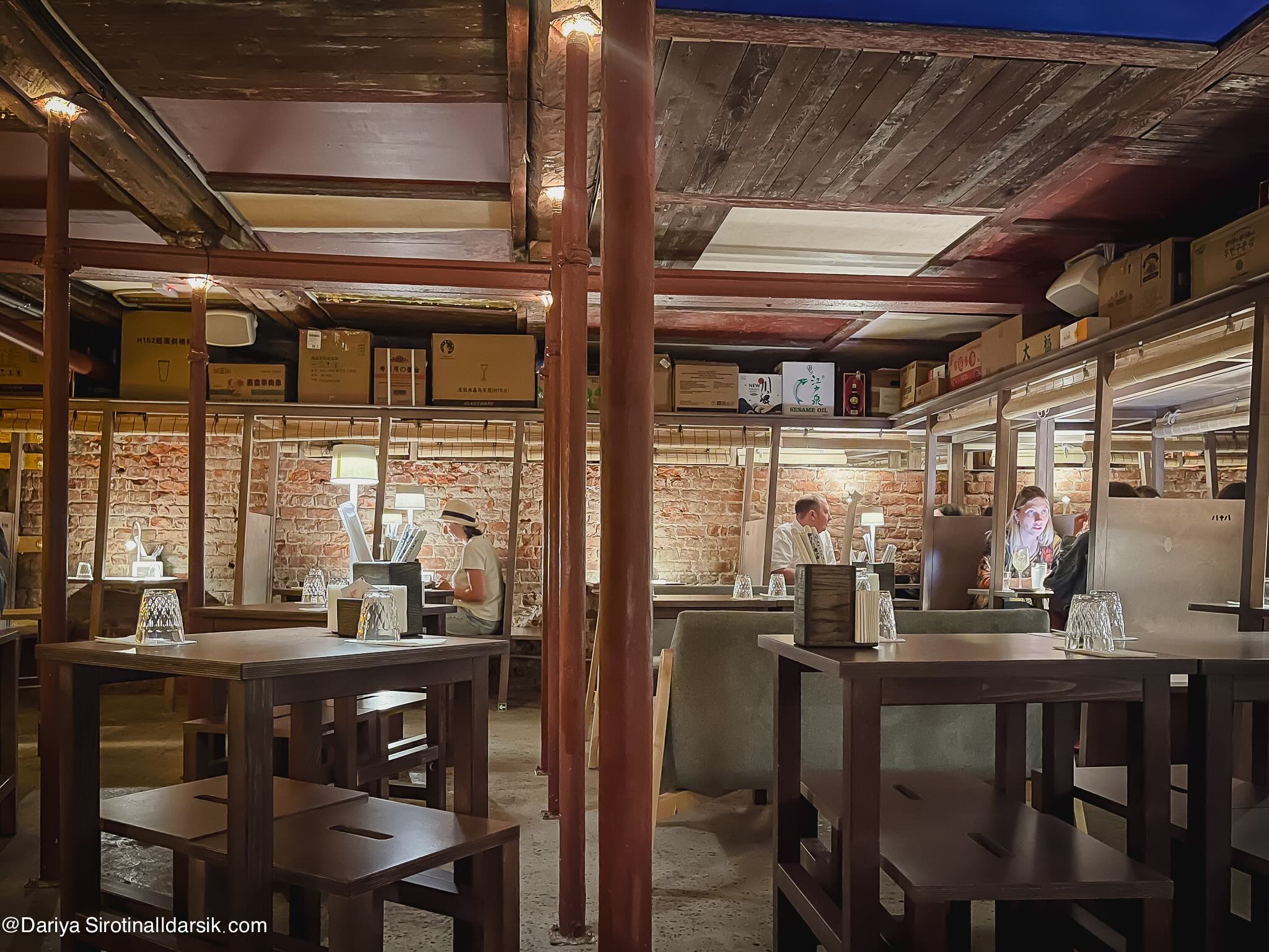 Не так давно открывшийся бар и закусочная в доме Мурузи, там, где расположен музей «Полторы комнаты», посвященный Иосифу Бродскому. Бар сделала та же команда, за интерьер, вернее, это даже не интерьер, а тотальная инсталляция, отвечал Александр Бродский (он же делал «Полторы комнаты»). Коктейли — от бара El Copitas. Мне сложно описать, что ждет вас внутри. Не обволакивающее, а скорее облегающее пространство, темное, потому что это подвал, в котором нет, кажется, ни одной прямой линии. Сколоченная из грубых досок мебель, кабинки-купе на двоих, где от соседа можно отгородиться бамбуковой шторкой, стопки картонных коробок с надписями на китайском под потолком. Попросите провести для вас экскурсию! И, пожалуйста, бронируйте столик как можно раньше!