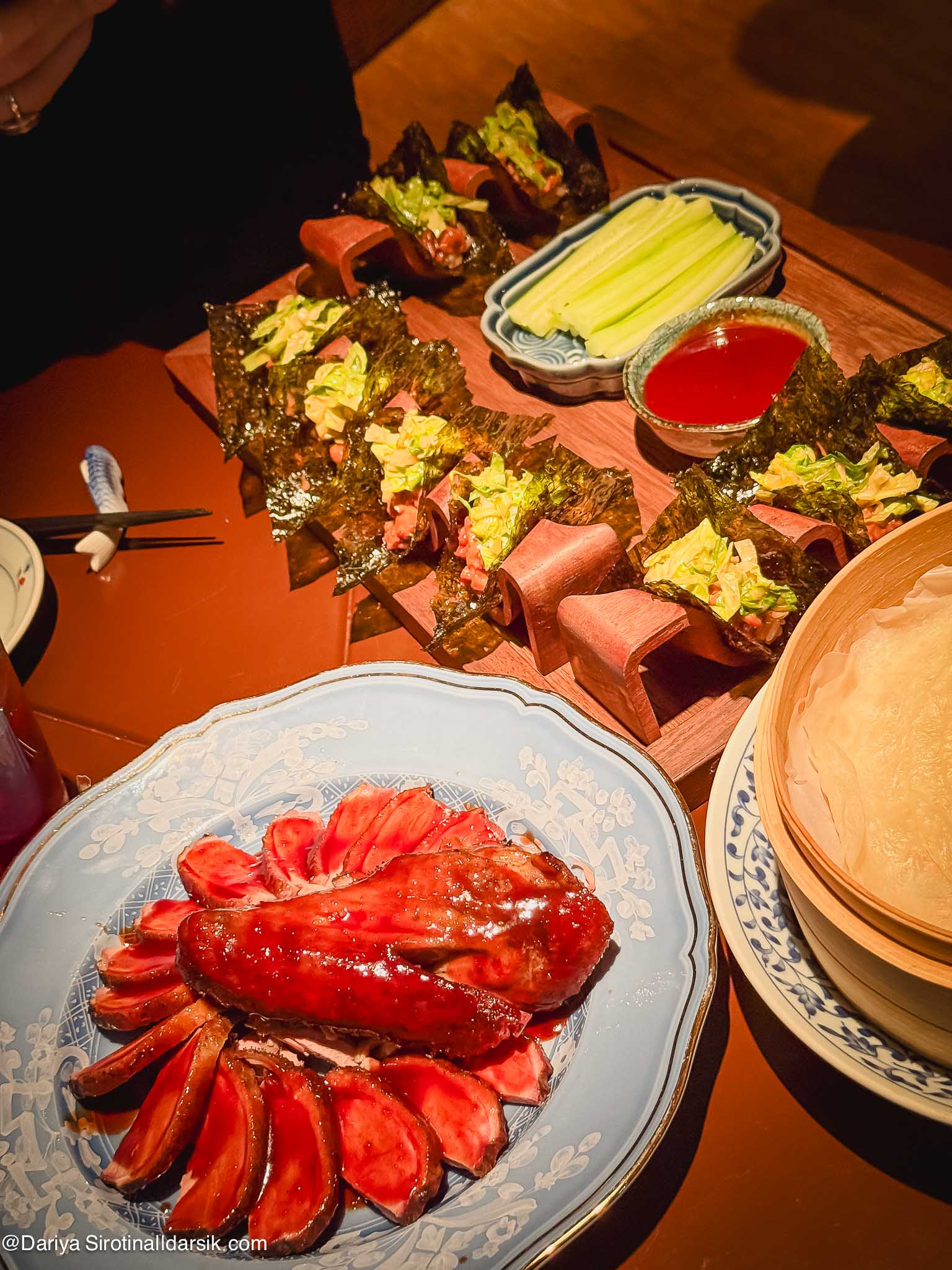 Это опять Петроградка, но ближняя ее часть. При желании сюда из «Астории» вы дойдете пешком за полчаса, перейдя Неву и полюбовавшись одной из лучших в мире панорам: стрелка Васильевского острова с одной стороны, Зимний дворец с другой. Темноватый гламурный зал в восточном стиле, отличная музыка (ну, как всегда в Self Edge!), прекрасный сервис, ледяное шампанское. В меню много сырой рыбы, которую лично я обожаю и за которой постоянно хожу в Self Edge что в Москве, что в Петербурге. Китайские влияния в Self Edge Chinois точечны и выверены. Упомянутые димсамы лишены малейшей липкости и практически эфемерны. Утка — подкопченная 👌🏻- подается с традиционными блинчиками, хойсином и огурцом, а вторым курсом — в виде восхитительнейших хенд-роллов. К ней предлагают взять рюмочку грушевого айсвайна — не отказывайтесь!