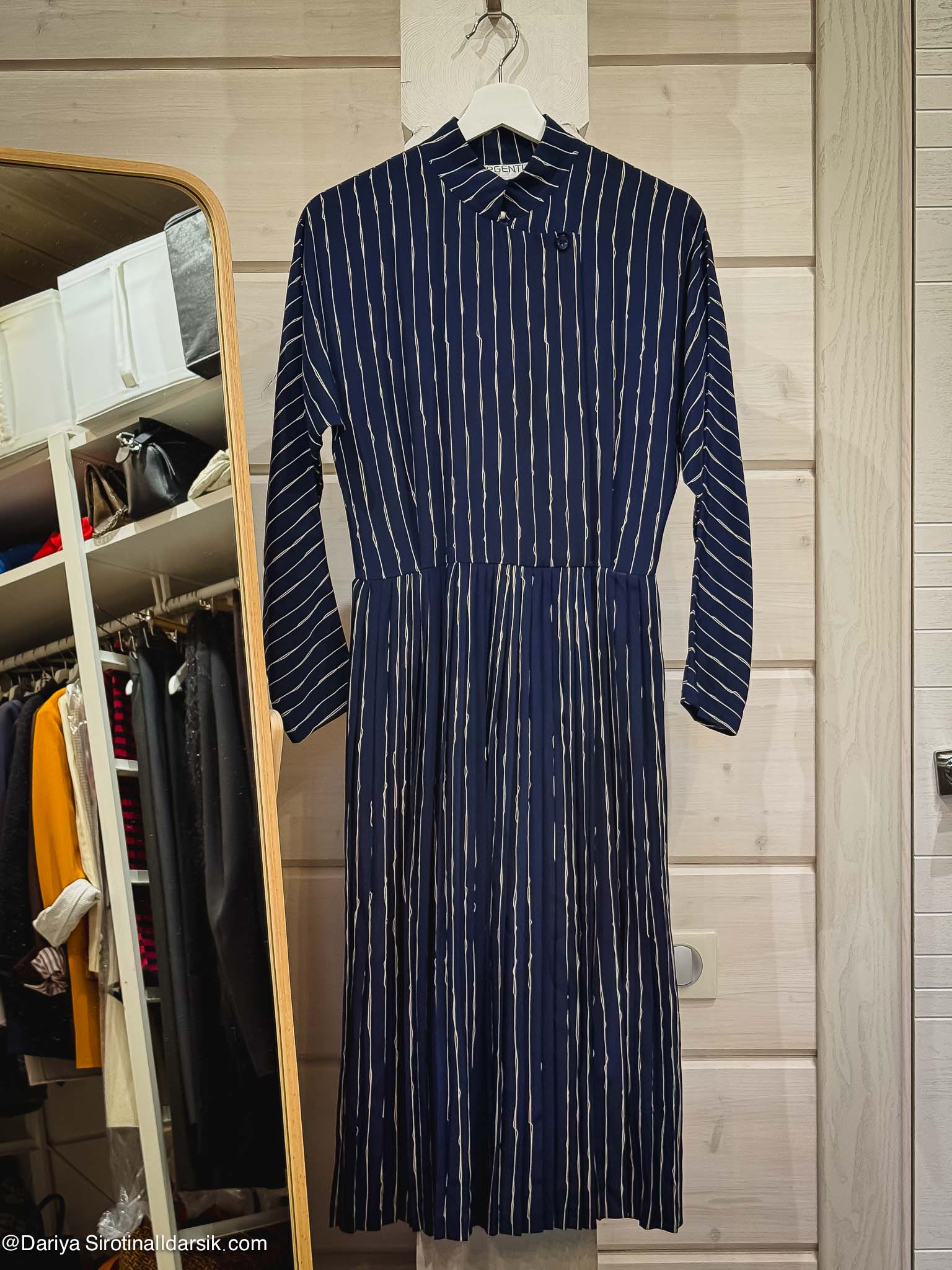 - Винтажное шелковое платье. Полоска у него — сливочного желтоватого оттенка, идеально подошла к одной из выбранных для поездки пар обуви.