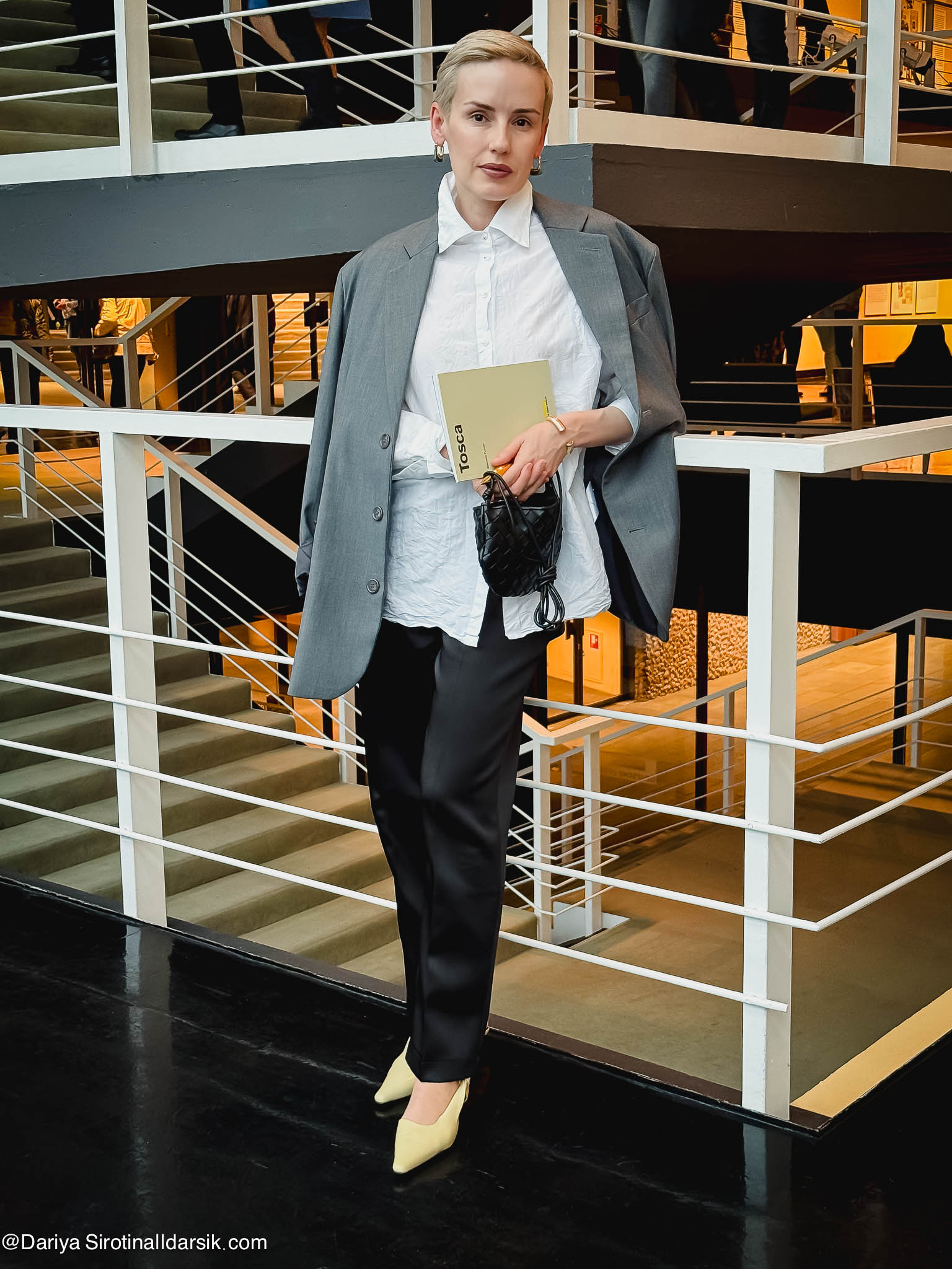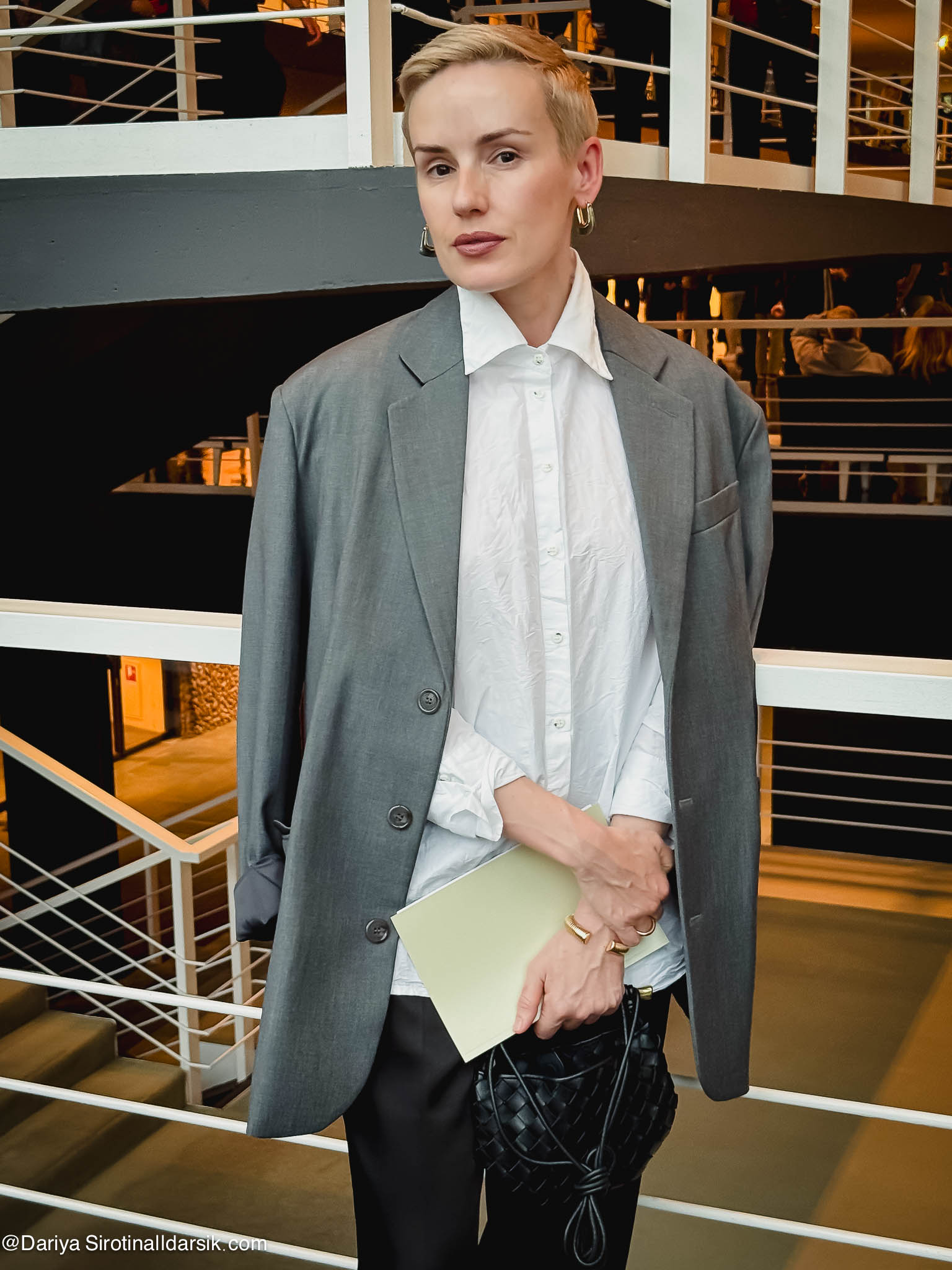 Рубашка «Линии», брюки Studio 29, жакет The Frankie Shop, туфли Adolfo Dominguez, сумка Bottega Venеta, серьги винтаж, браслет Mango. Сверху был плащ Toteme.
