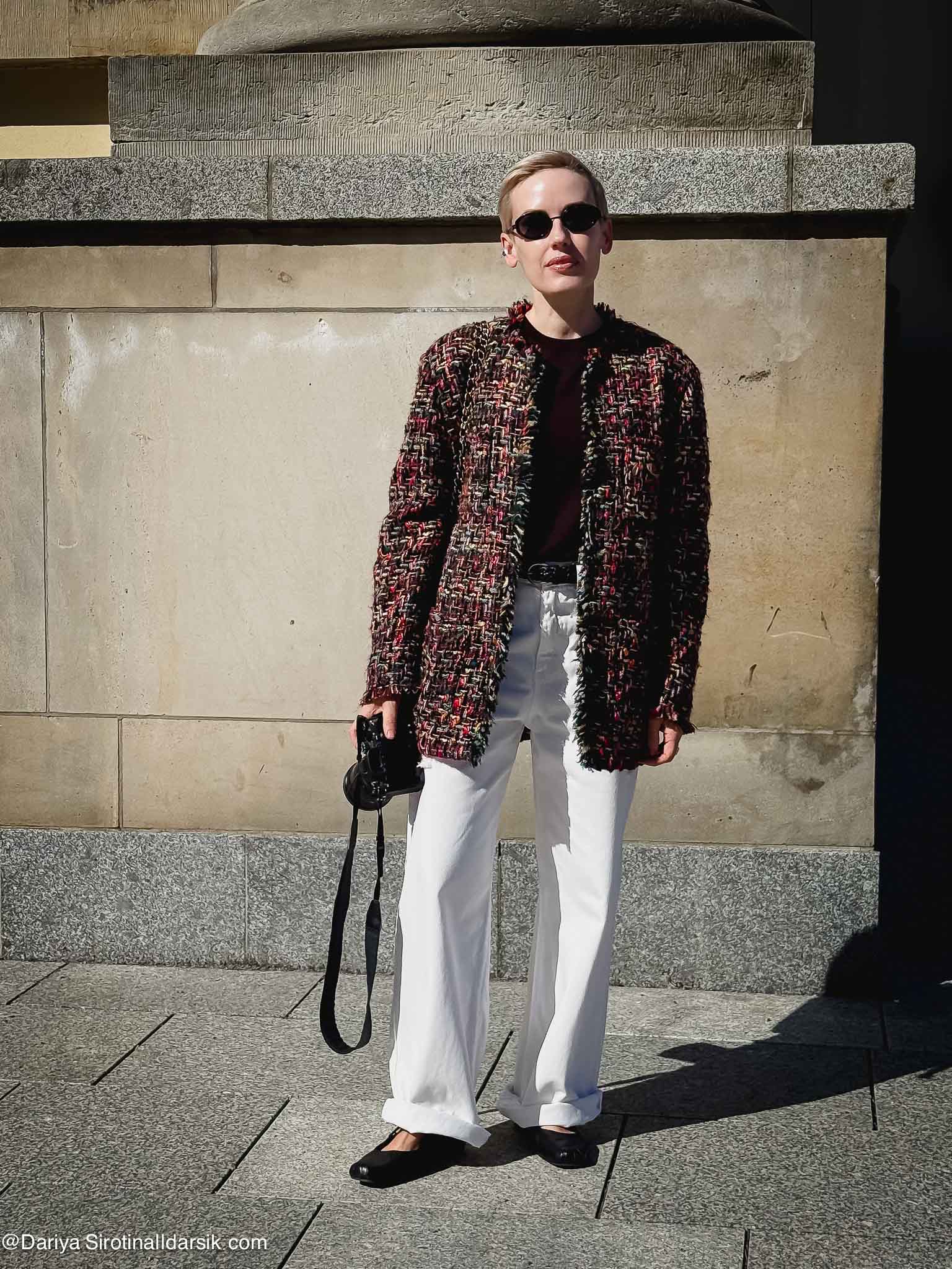 Мне нравится контраст объемного жакета и миниатюрных балеток, цветовая рифма между жакетом, джемпером и сумкой и то, как эти темные цвета контрастируют с белыми джинсами.