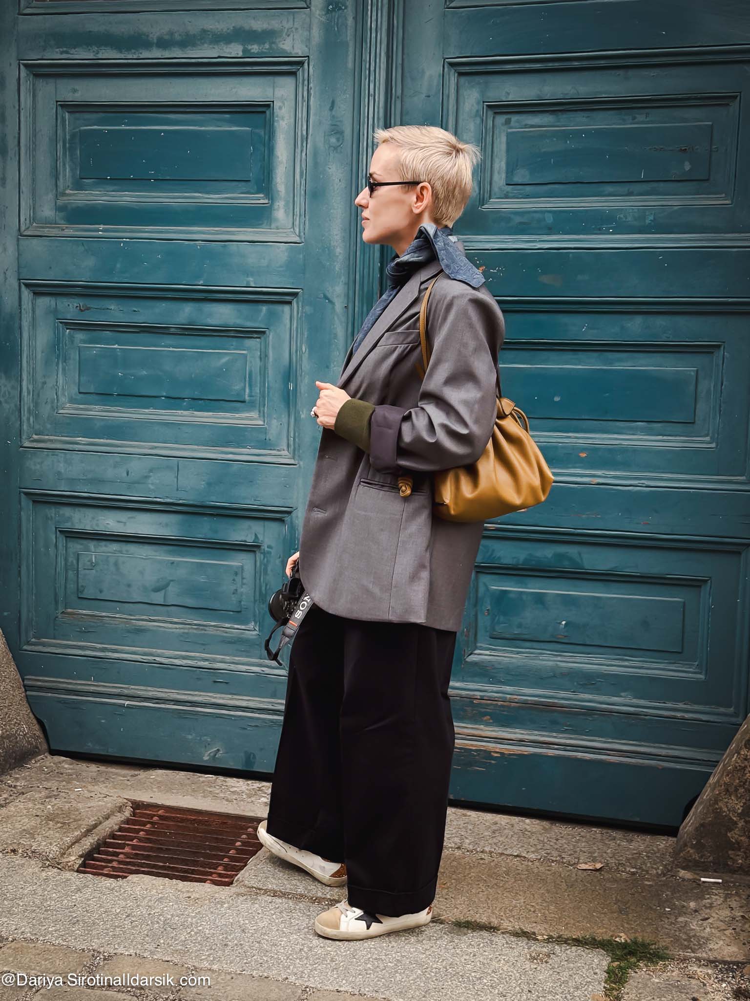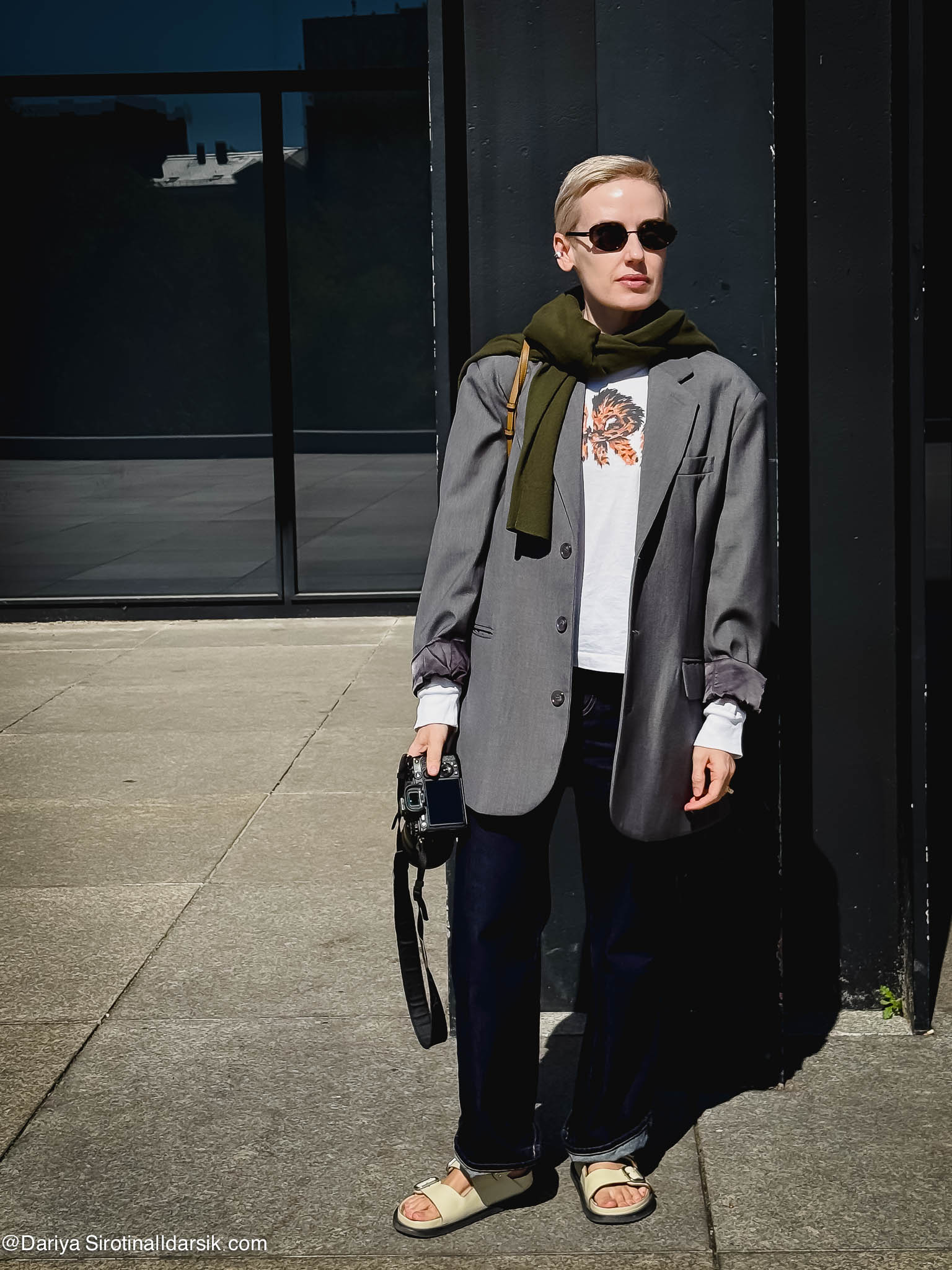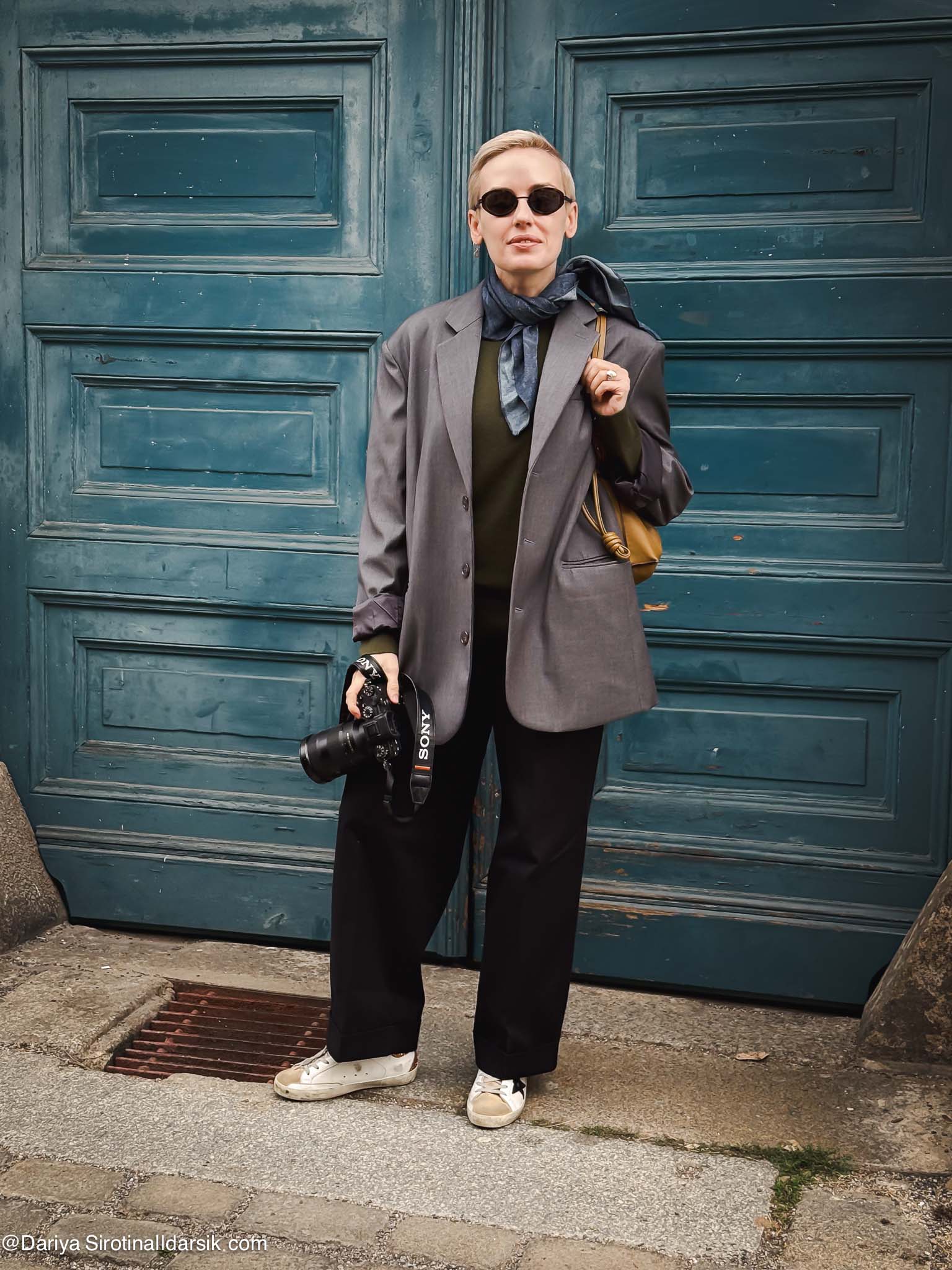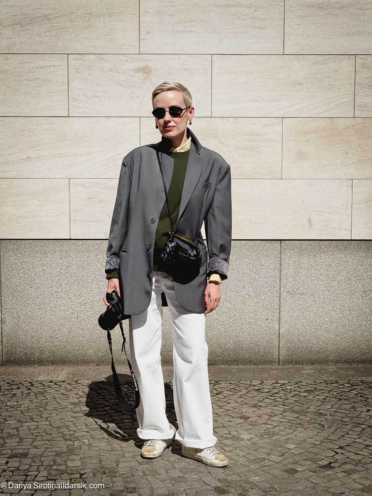 В Берлине похолодало, но многослойность меня выручила: под джемпером у меня белая футболка. Сочетание брюк со стрелками, расслабленной обуви и объемного жакета делает образ стильным, бандана и сумка создают акцент.