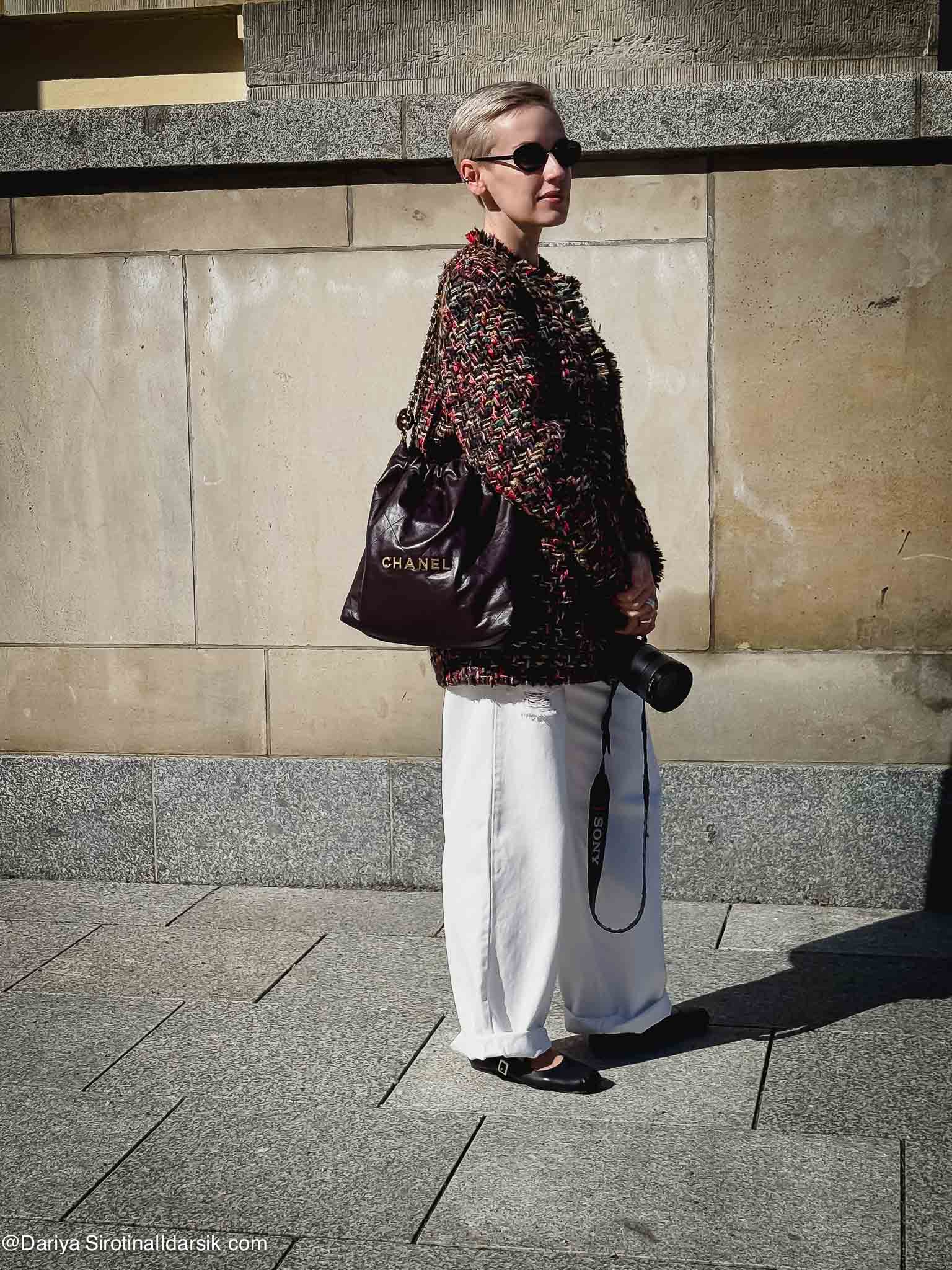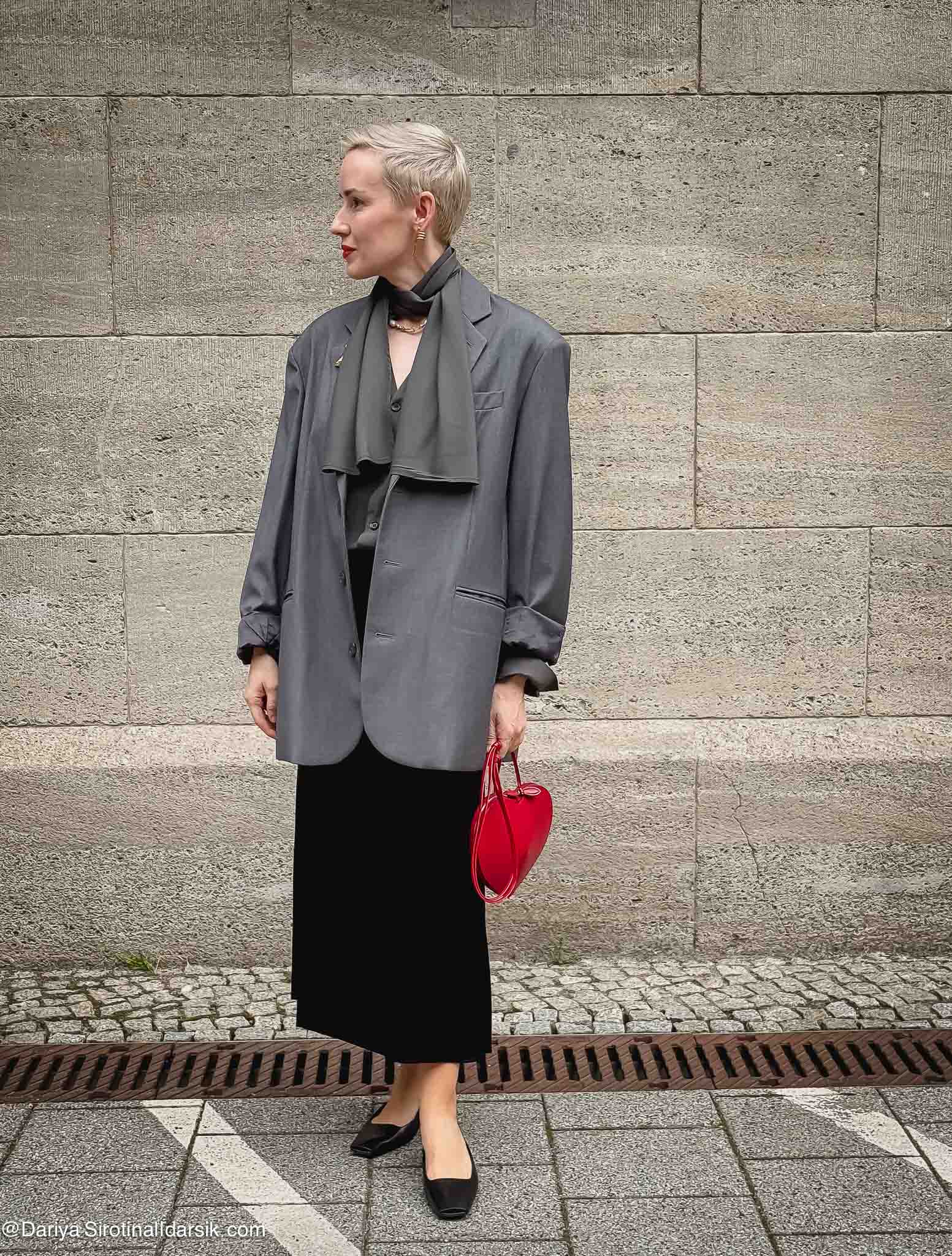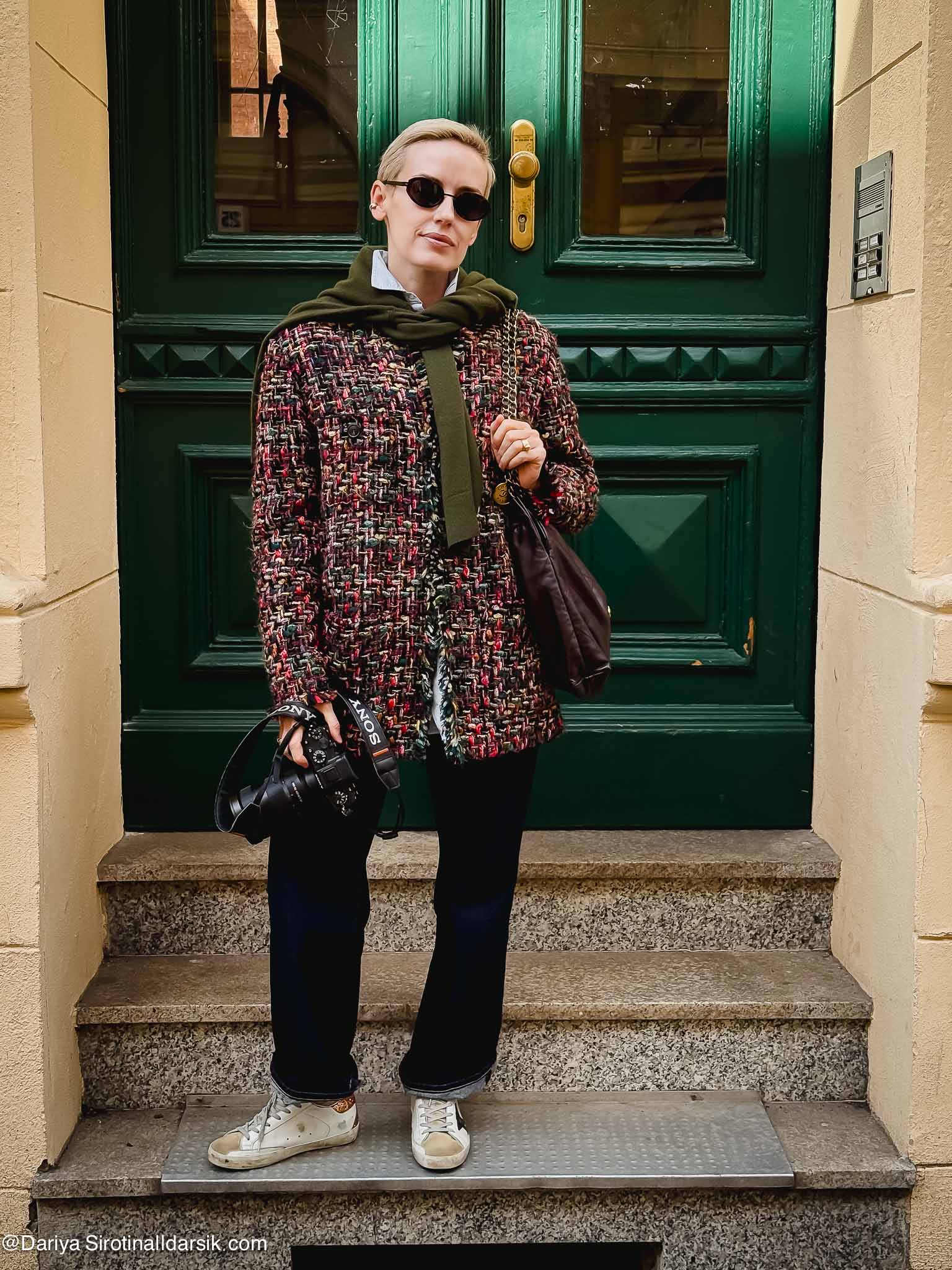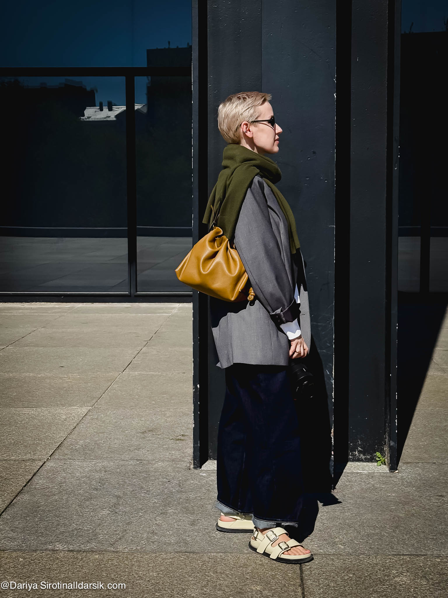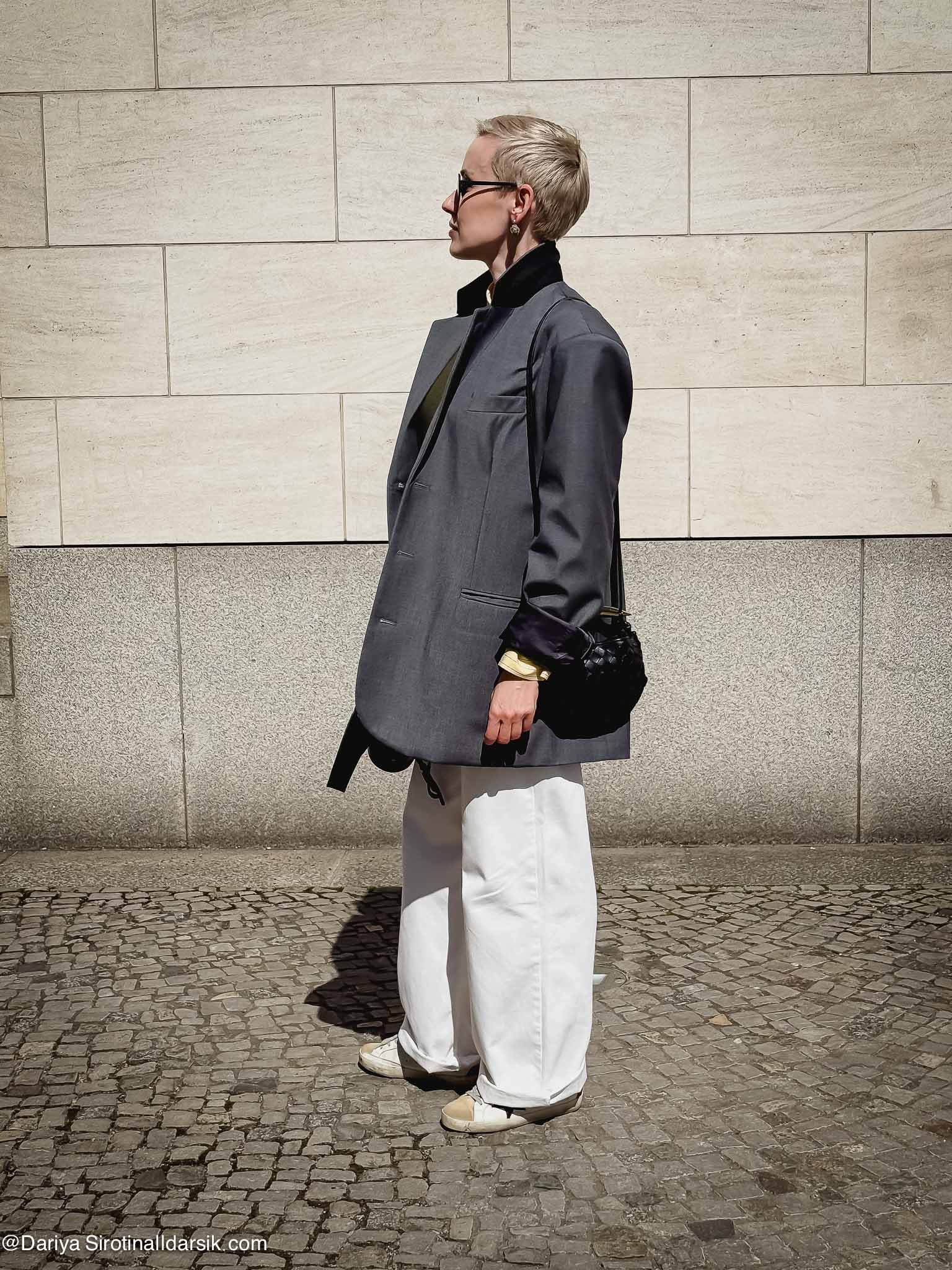 В Берлине похолодало, но многослойность меня выручила: под джемпером у меня белая футболка. Сочетание брюк со стрелками, расслабленной обуви и объемного жакета делает образ стильным, бандана и сумка создают акцент.