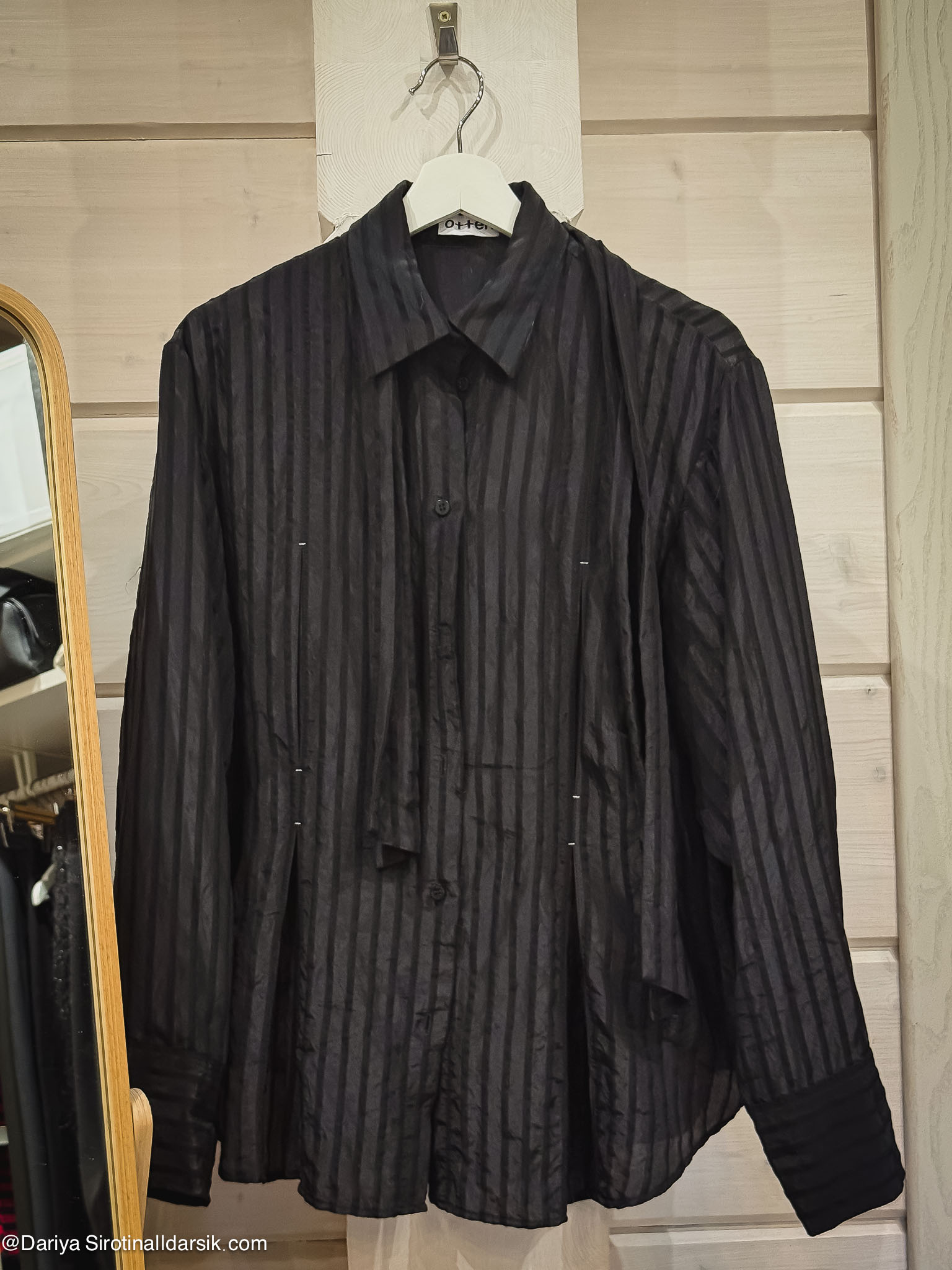 - Черная блузка Otten. Ее большое достоинство — ее не нужно гладить. Вытащил из чемодана — и вперед. Ленту под воротником можно завязывать как бант или галстук, а можно — как пояс.