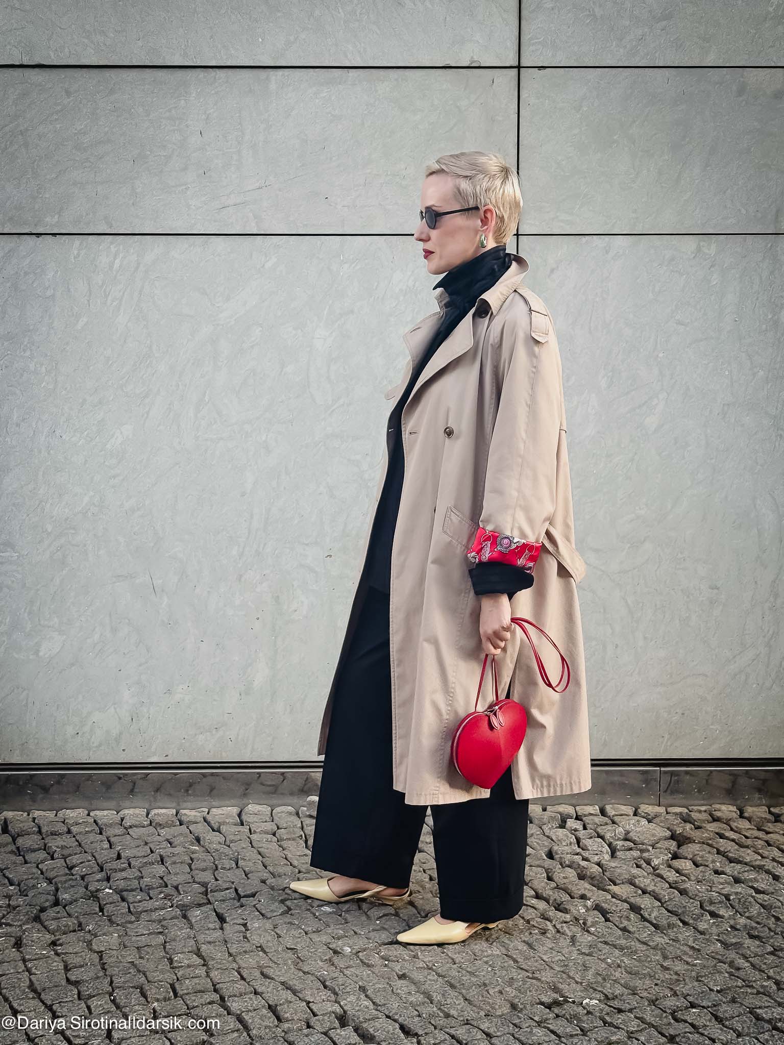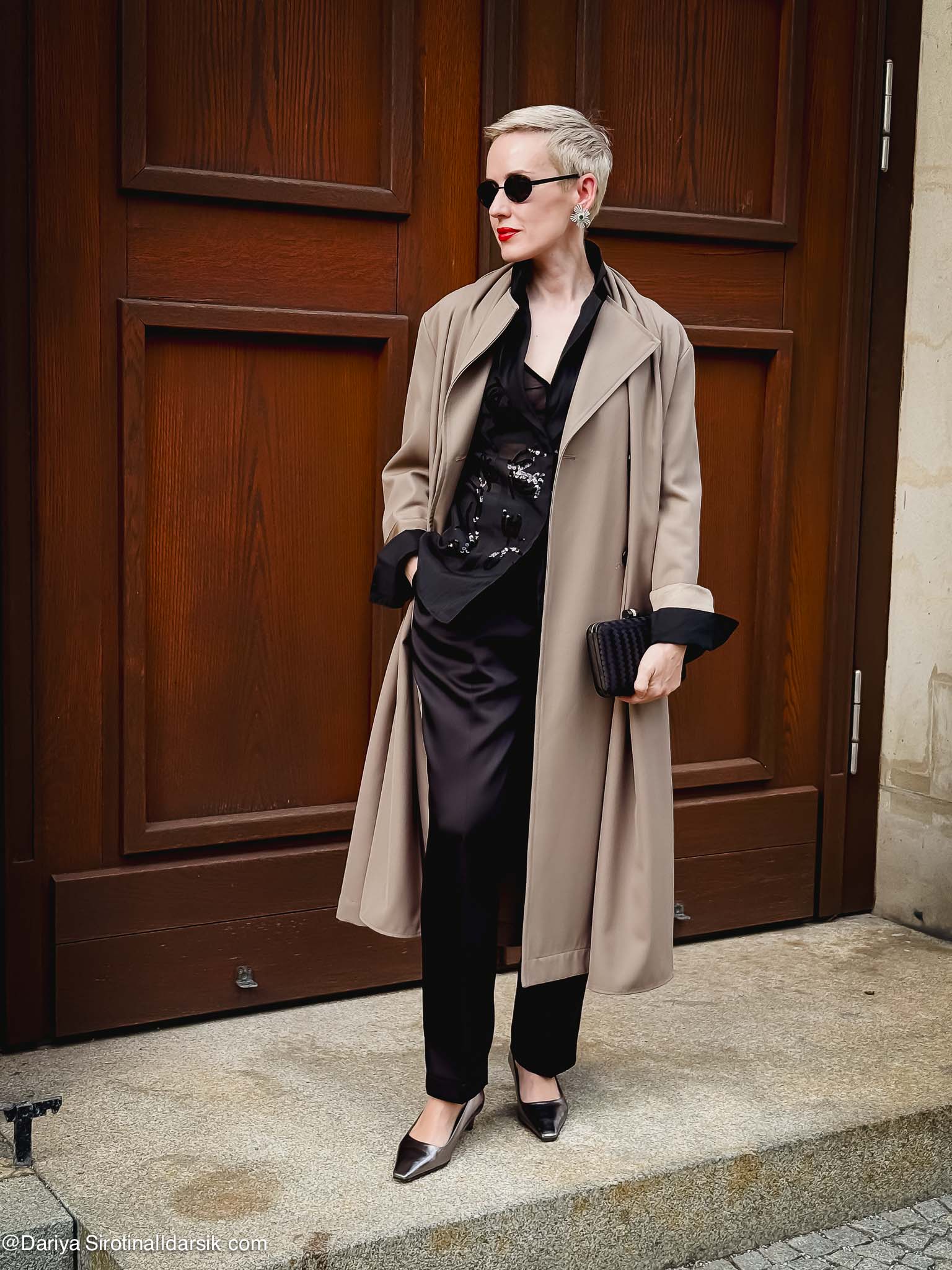 Брюки Razumno, рубашка Otten, винтажный плащ, туфли Adolfo Dominguez, сумка Alaia.