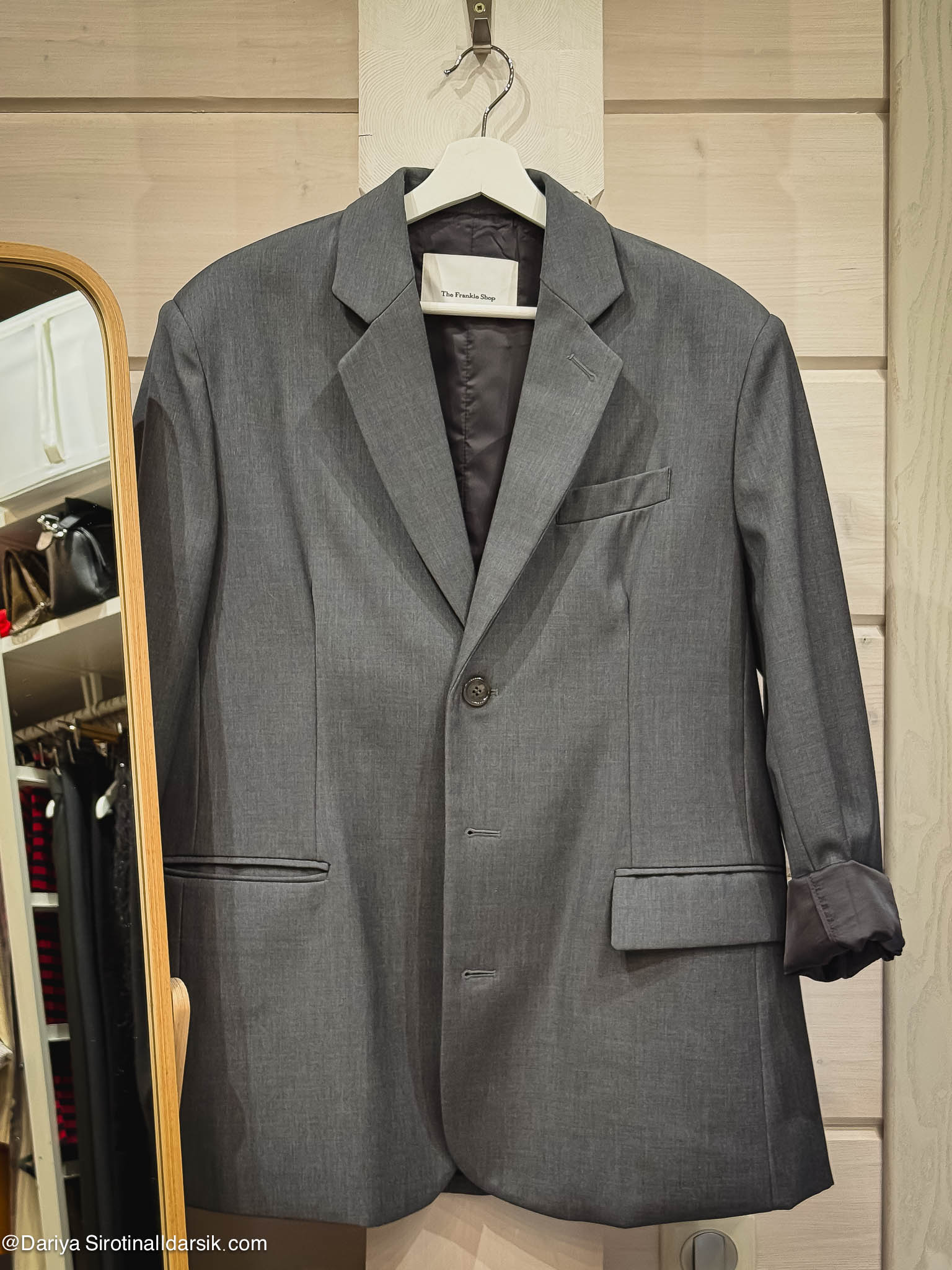 - Серый объемный жакет The Frankie Shop. Достаточно объемный, чтобы быть надетым поверх джемпера и рубашки днем, достаточно элегантный, чтобы быть парой для блузок и атласных брюк или юбки.