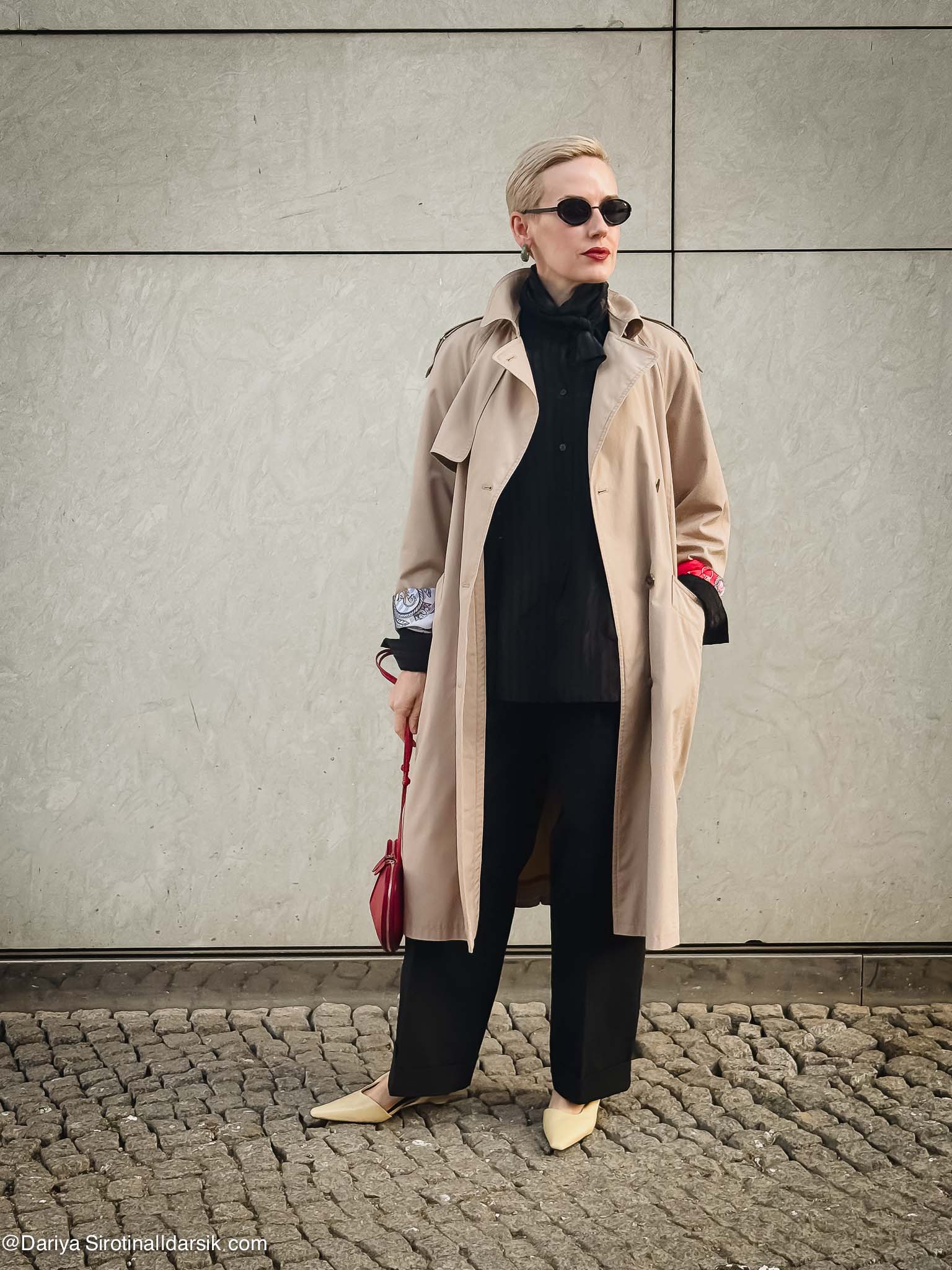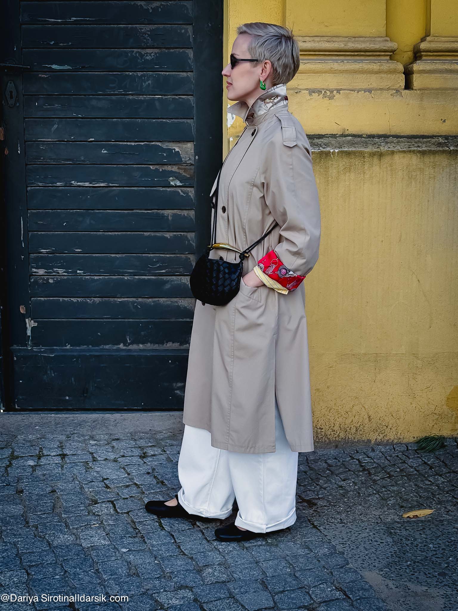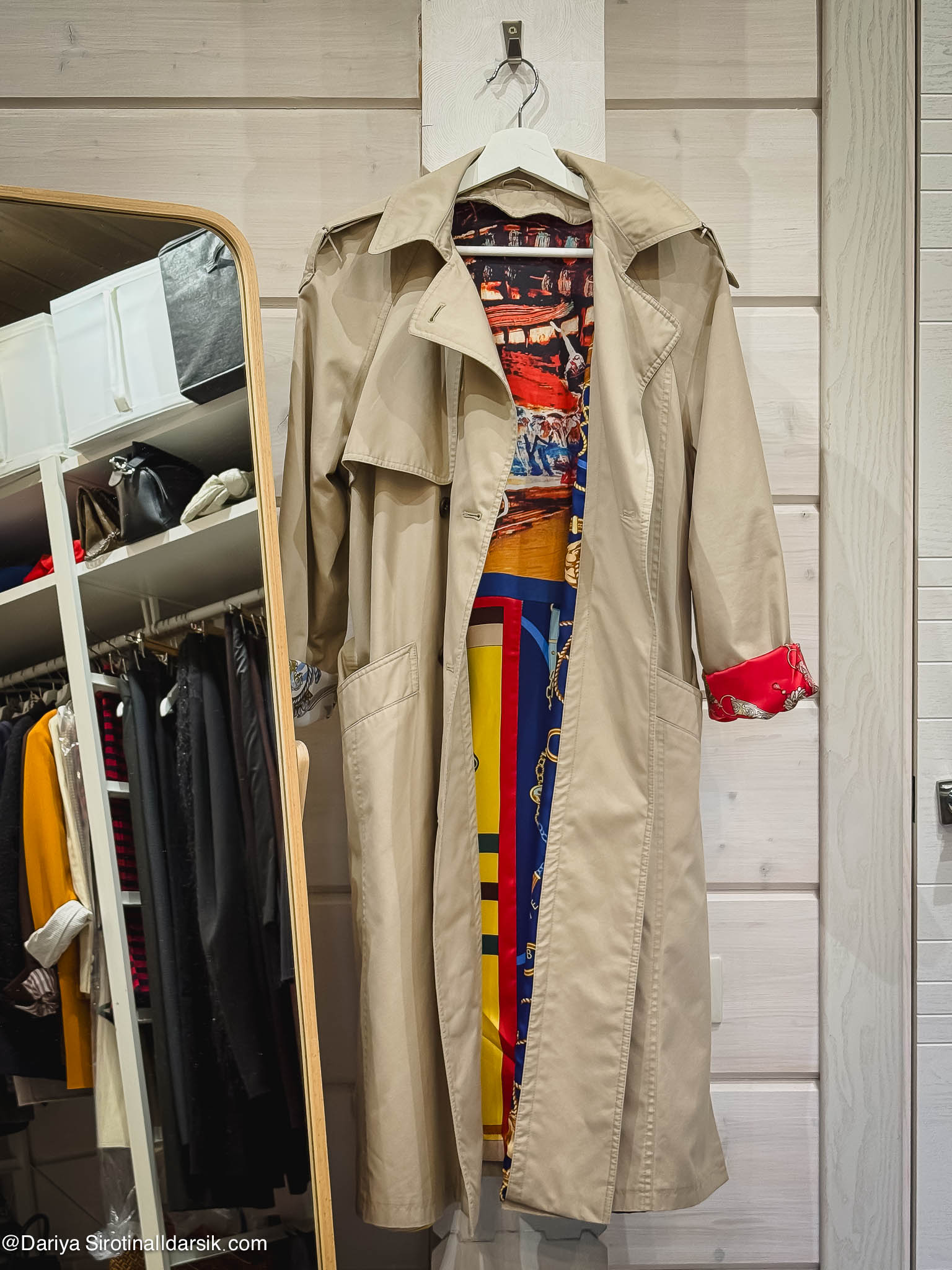 - Винтажный плащ, купленный много лет назад в Берлине, и обновленный в этом сезоне: я поменяла подкладку, выбрав для нее несколько подходящих друг другу по цвету шейных платков. Легкий, комфортный, он хорошо смотрится как с юбками и платьями, так и с брюками и джинсами.