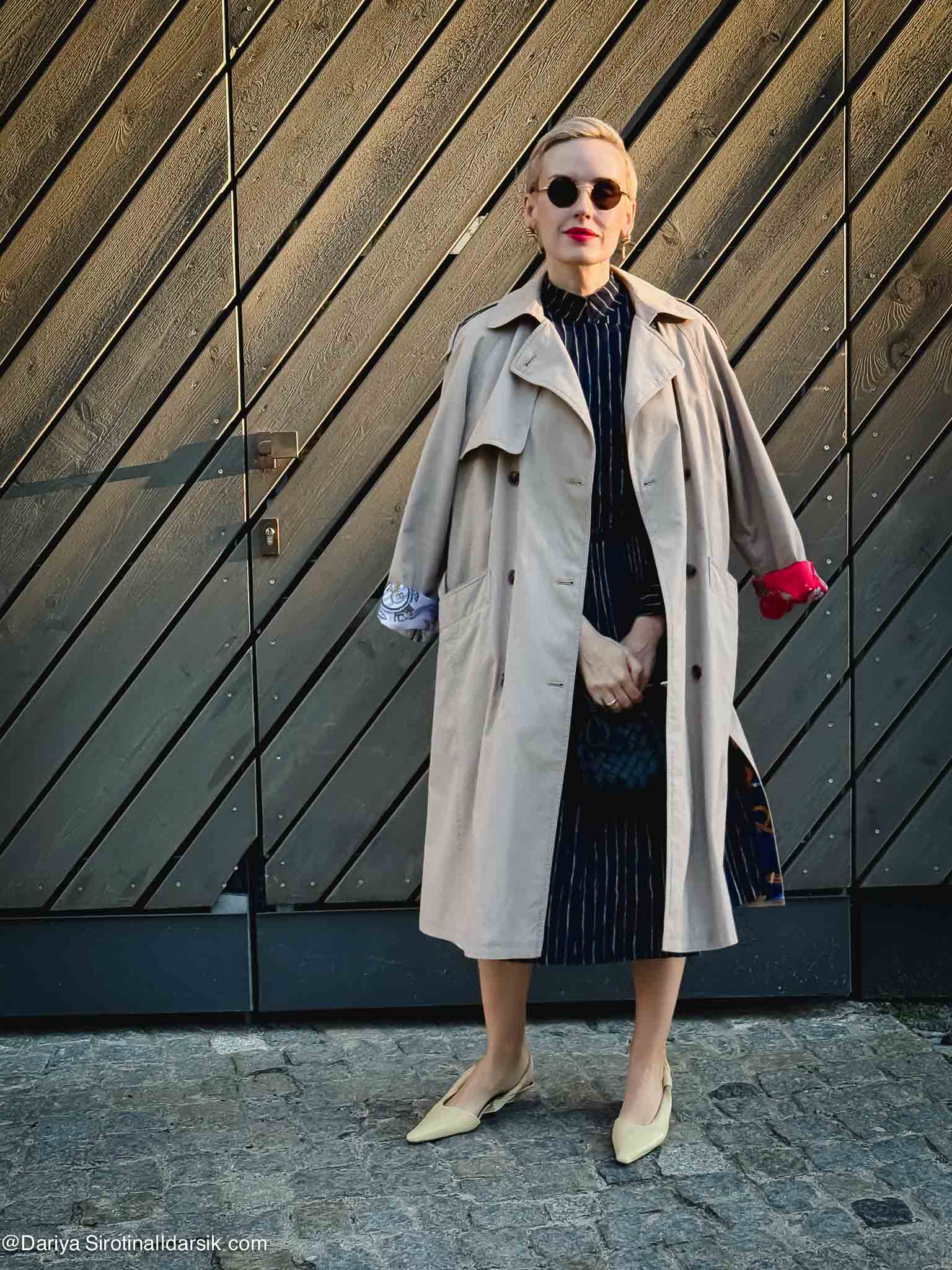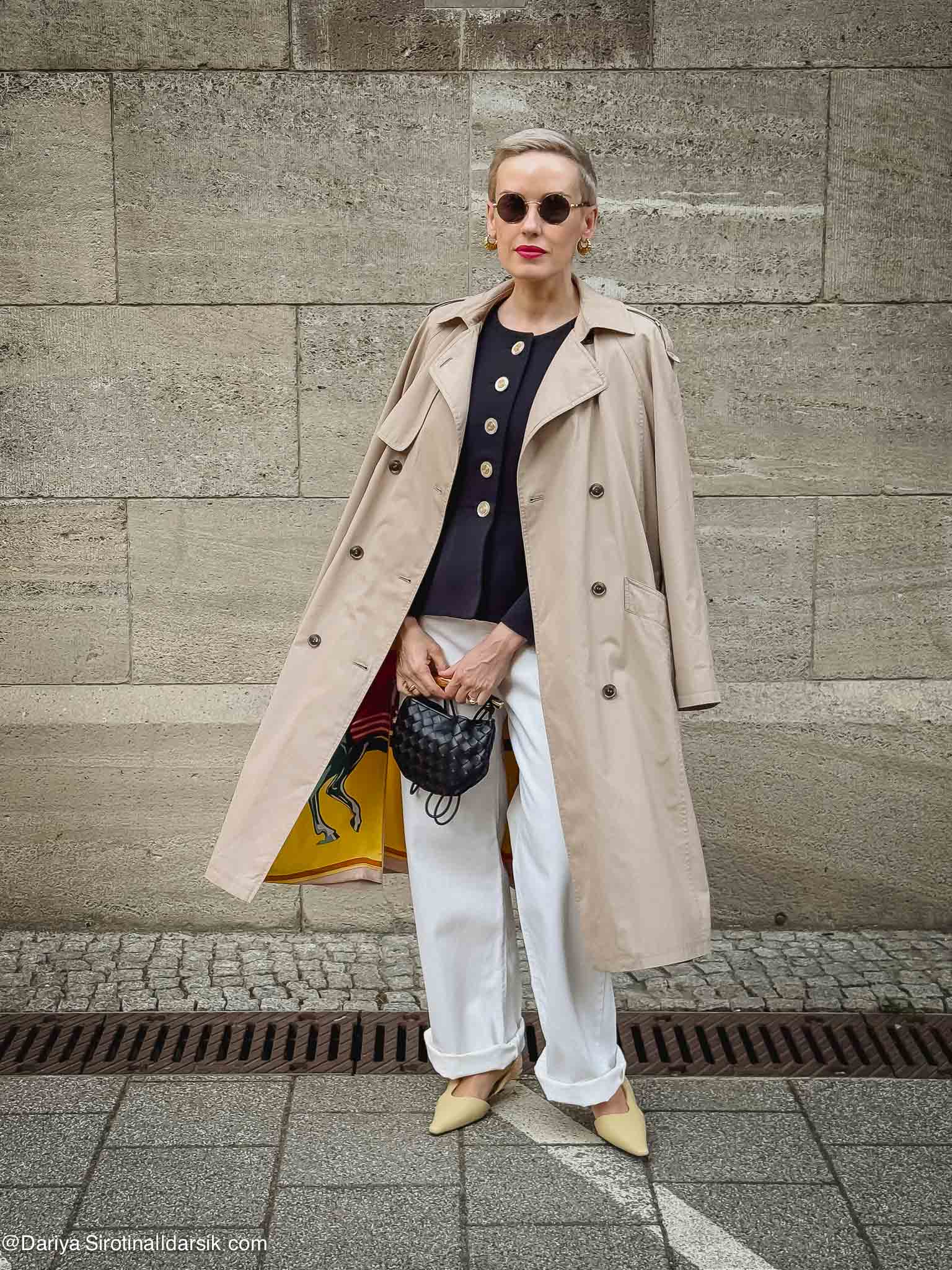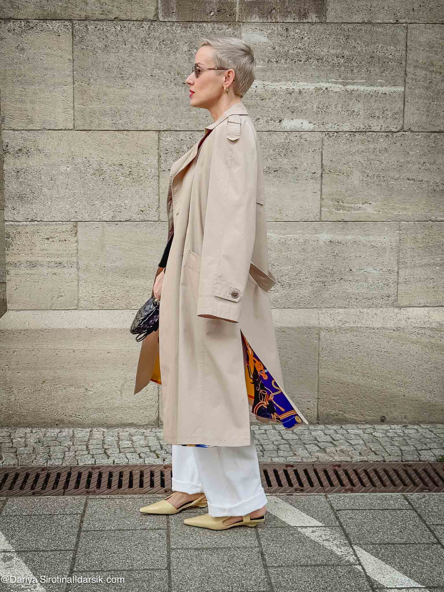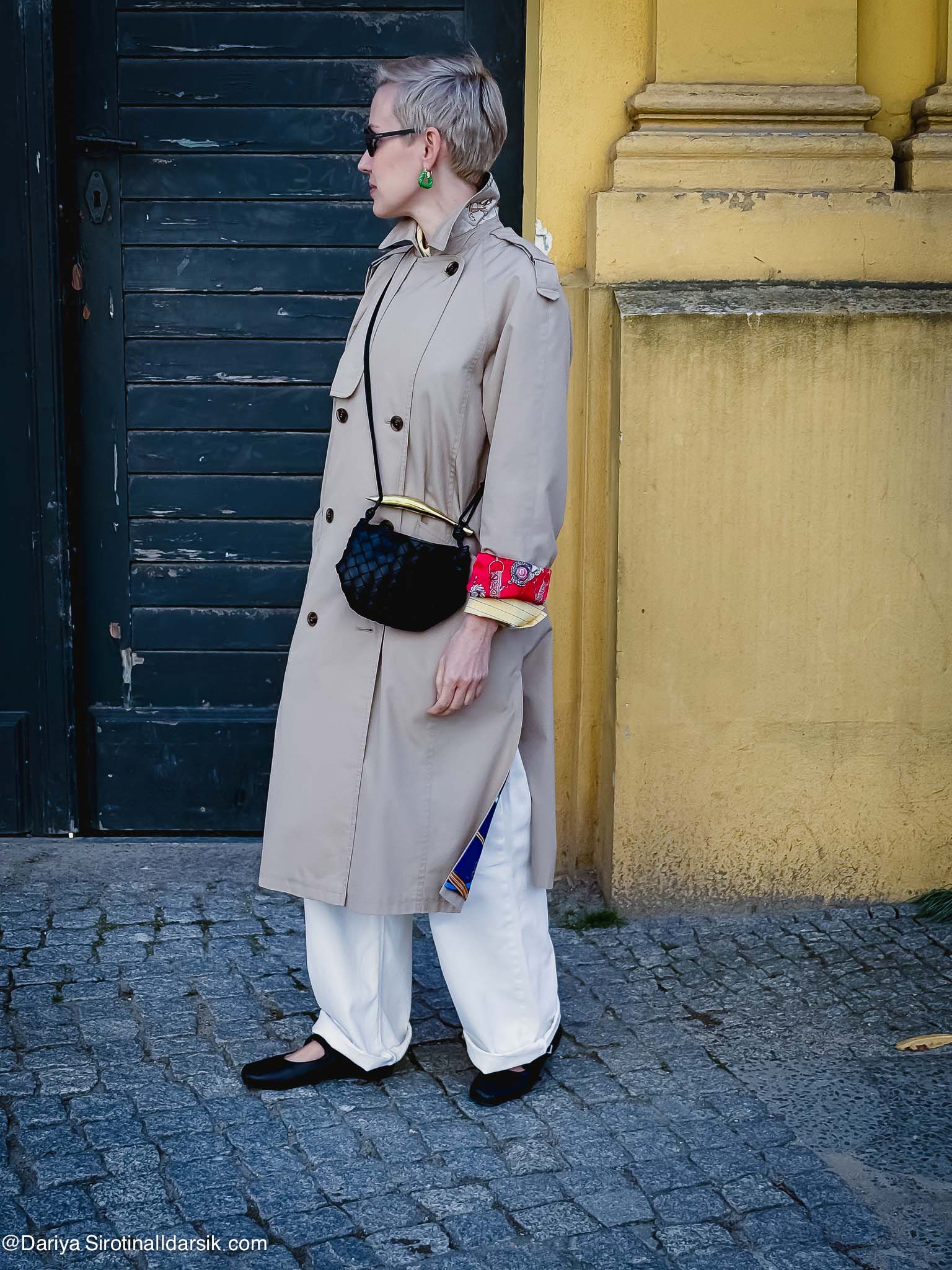 - Винтажный плащ, купленный много лет назад в Берлине, и обновленный в этом сезоне: я поменяла подкладку, выбрав для нее несколько подходящих друг другу по цвету шейных платков. Легкий, комфортный, он хорошо смотрится как с юбками и платьями, так и с брюками и джинсами.