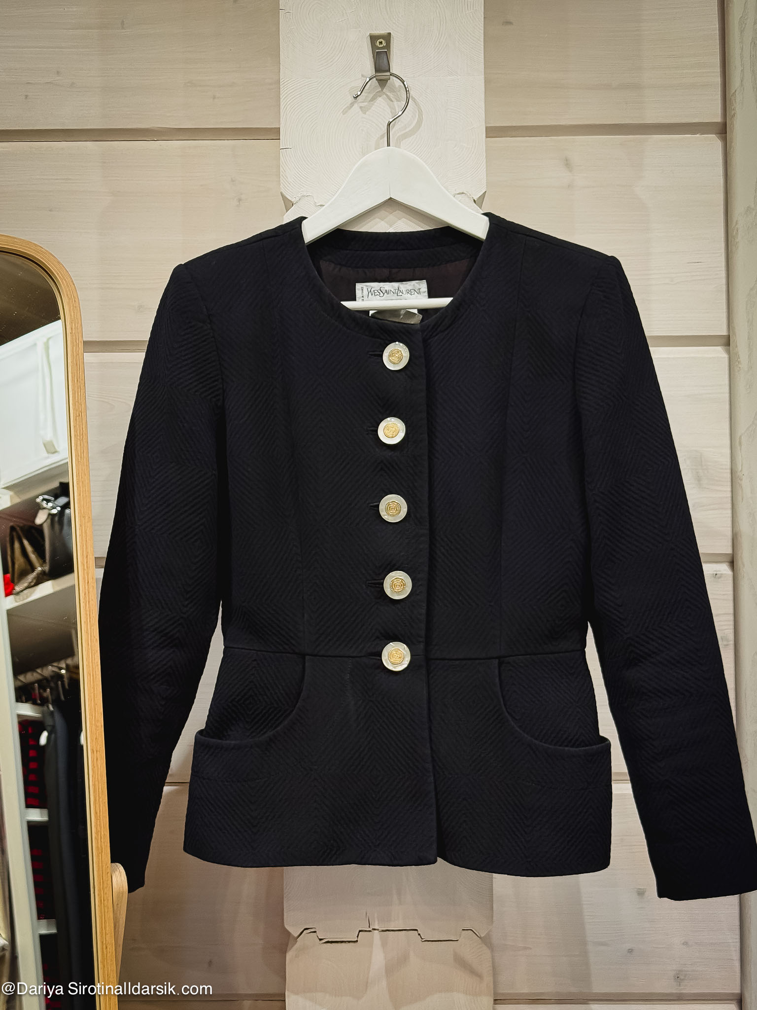 - Винтажный жакет YSL Encore. Сшит из хлопка в рубчик, украшен перламутровыми пуговицами, имеет четкую линию плеча и структурный силуэт.