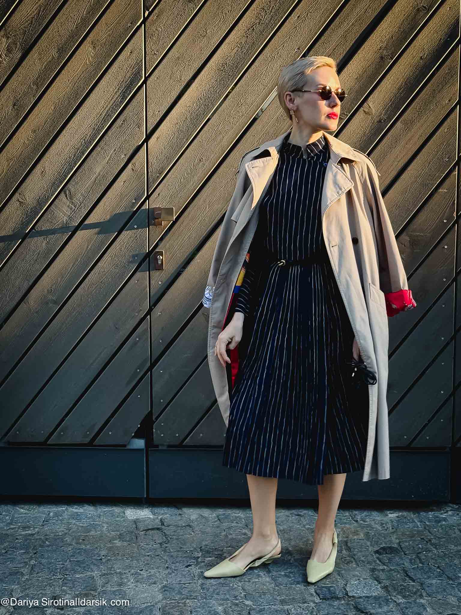Давно не надевала это платье! Добавила ему акцента в виде ремешка-узелка и подчеркнула полоску туфлями в тон. Яркая подкладка плаща собирает весь образ!