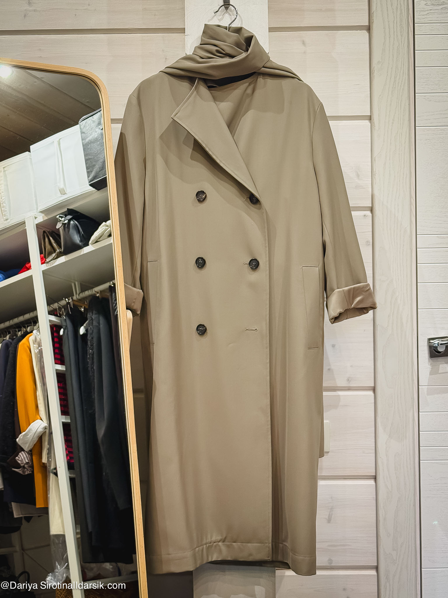 - Тренч Totemе с длинным несъемным палантином. Вещь скорее на выход. В поездке был запланирован поход в театр, мне хотелось одеться чуть более нарядно, но не вычурно. И этот тренч идеально вписался в мою затею.