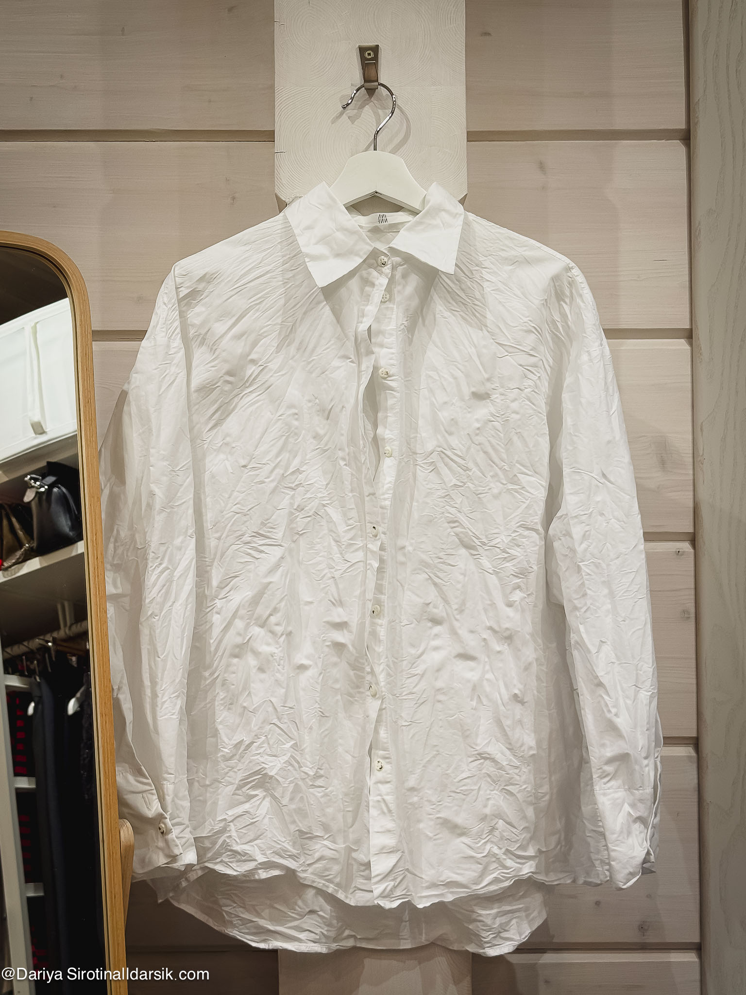 - Белая рубашка «Линии». Сшита из держащего форму хлопка и задумана мятой. После стирки я сворачиваю ее улиткой для того, чтобы ткань фактурно морщилась.