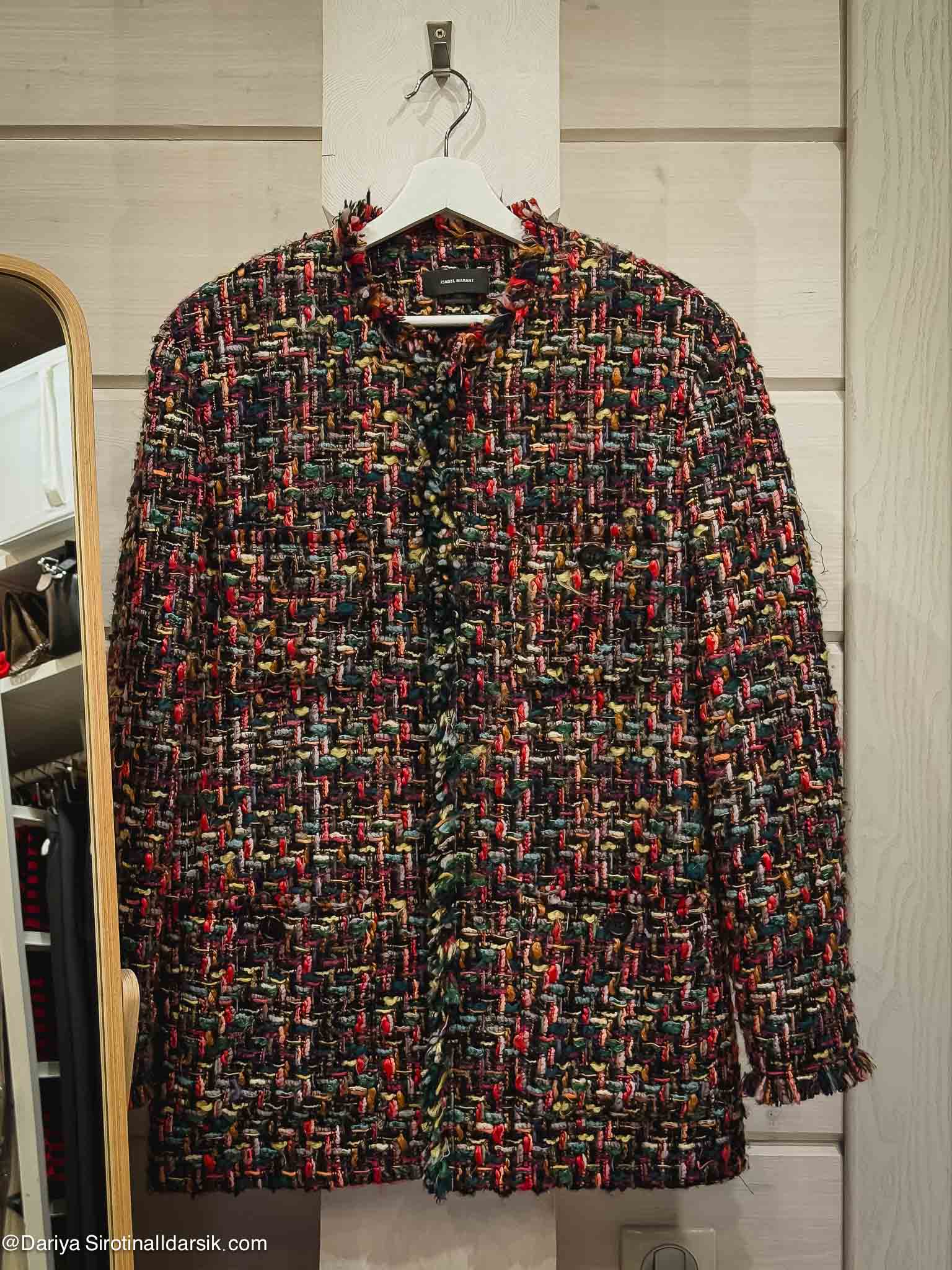 - Твидовый жакет Isabel Marant. Достаточно объемный, чтобы под него можно было надеть свитер, невероятно комфортный за счет подкладки из тонкого трикотажа. Хорошо выглядит что с туфлями, что с кроссовками.