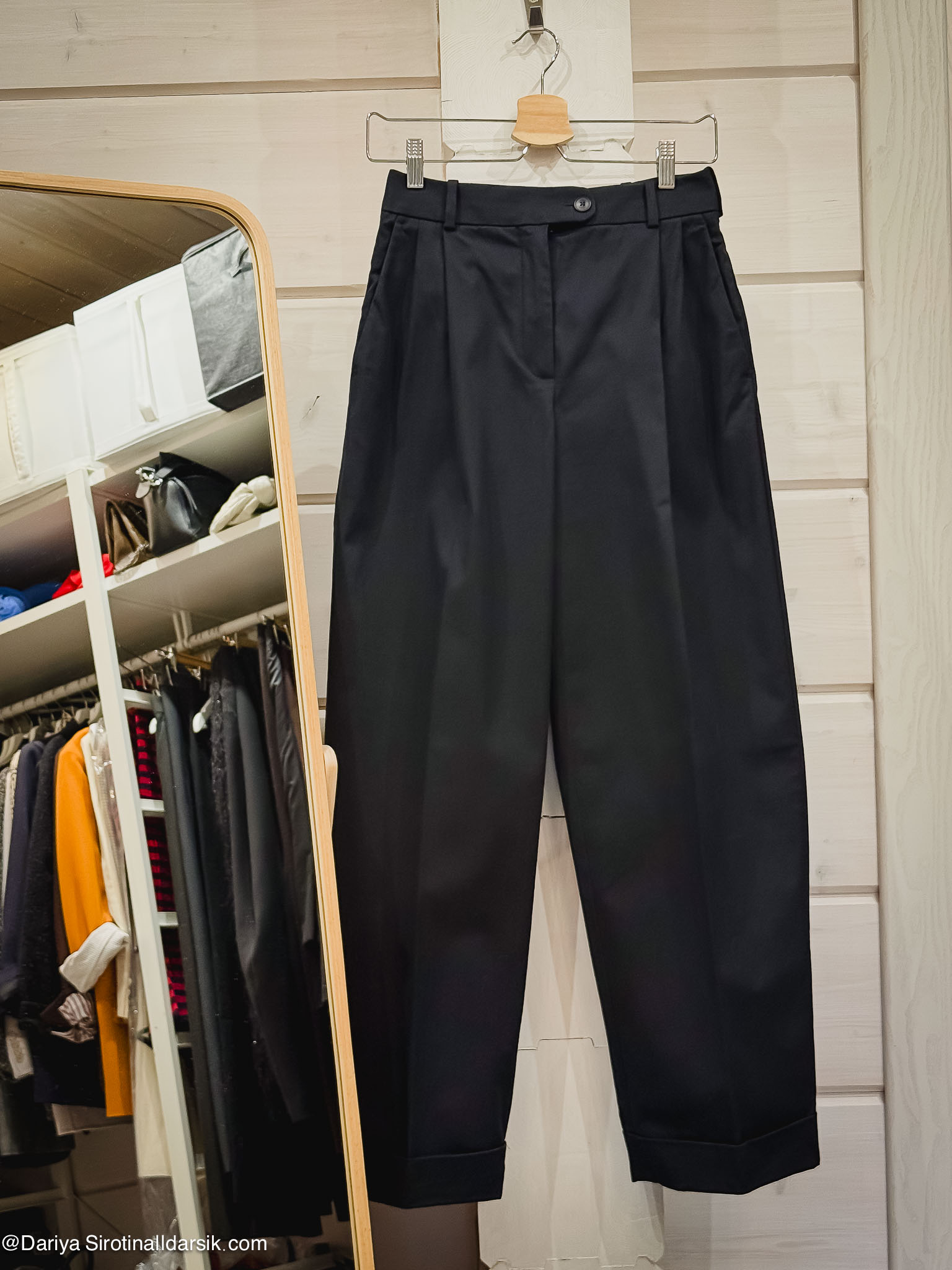 - Черные широкие брюки из хлопка Razumno. Держат форму, держат стрелку, отлично смотрятся с кроссовками, сандалиями, балеткам, туфлями — да с чем угодно.
