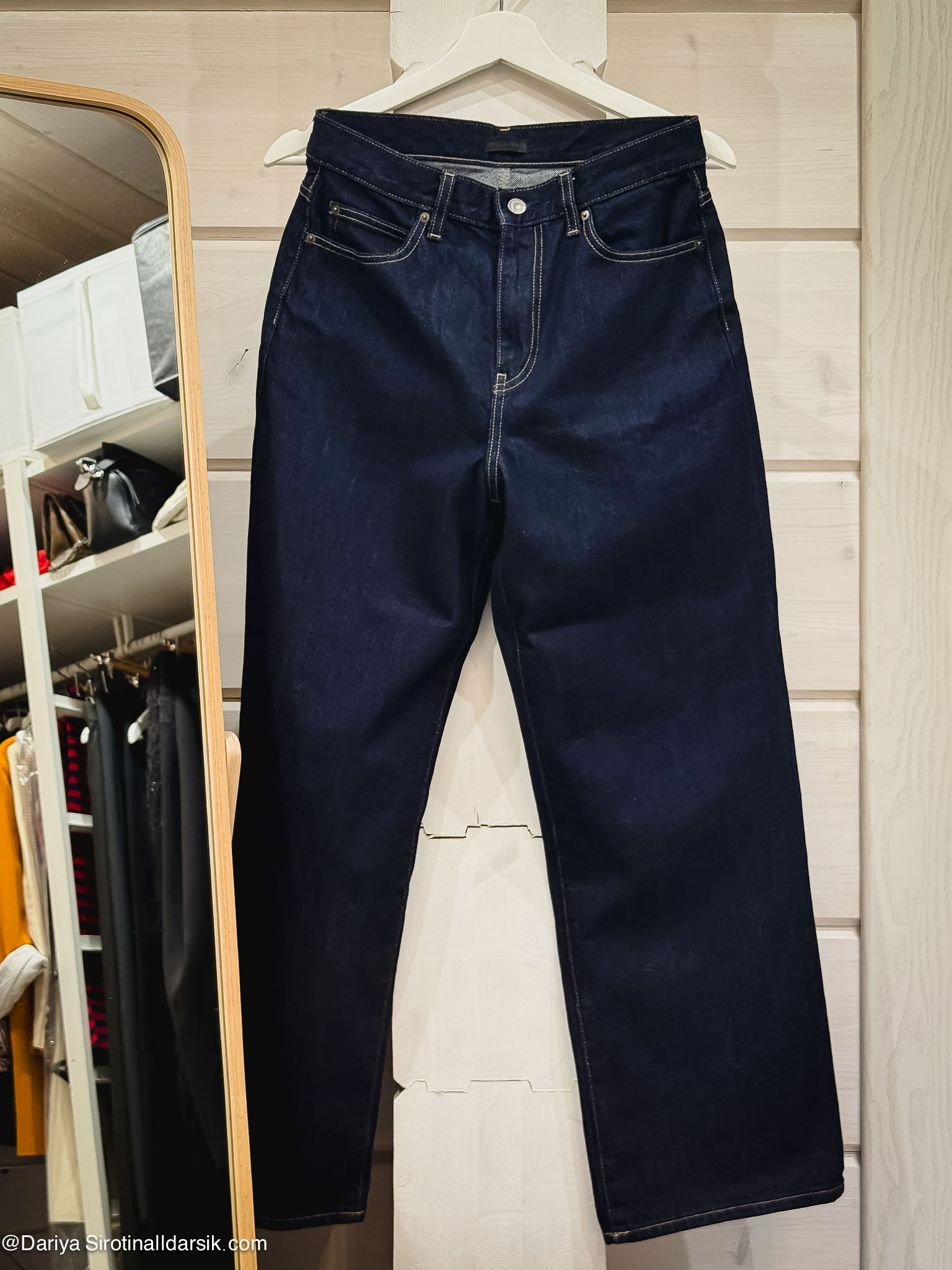 - Темно-синие джинсы Uniqlo. Прямые, с достаточным объемом в бедрах и талии, комфортные для повседневной носки и для перелета. В зависимости от типа обуви их можно подвернуть.