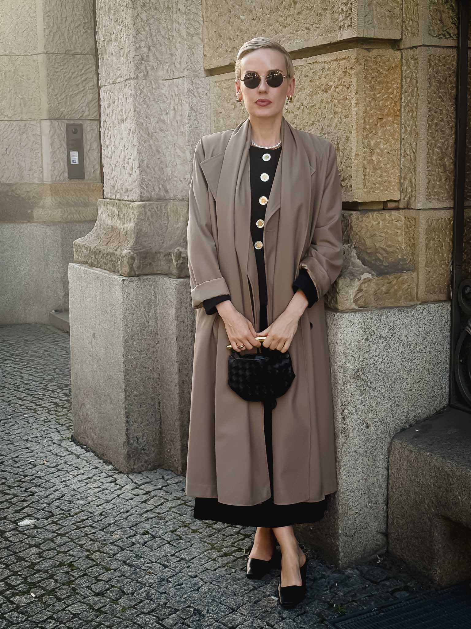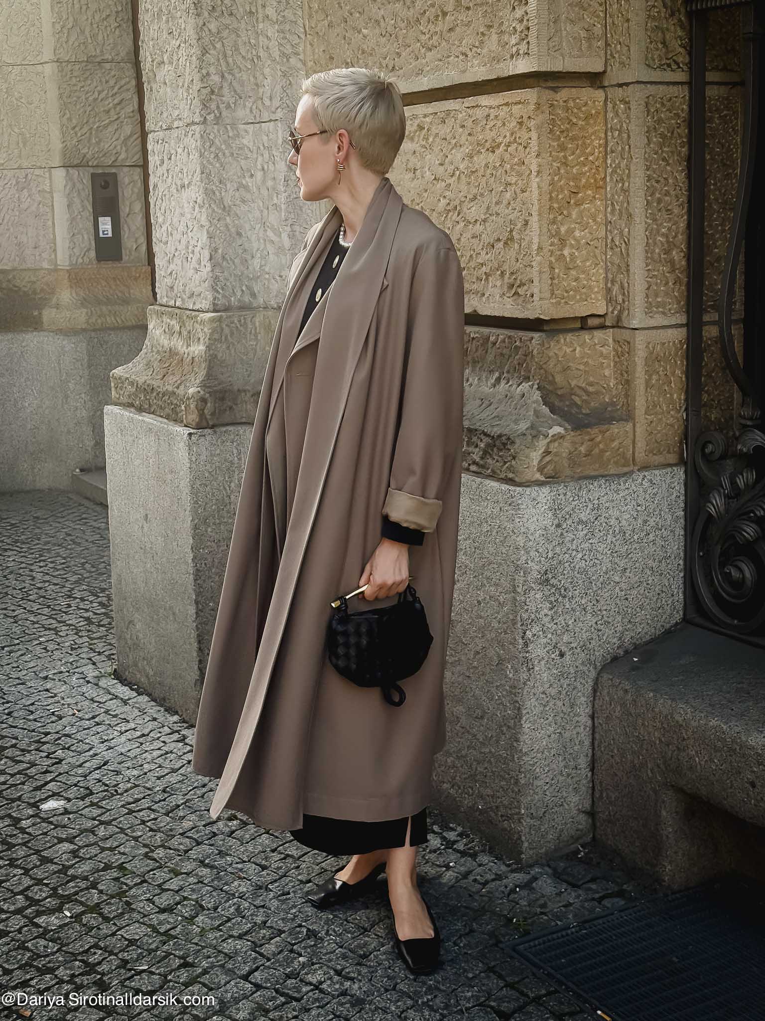 Плащ Toteme, юбка Loewe, жакет YSL Encore винтаж, винтажные украшения, обувь Toteme, сумка Bottega Veneta.