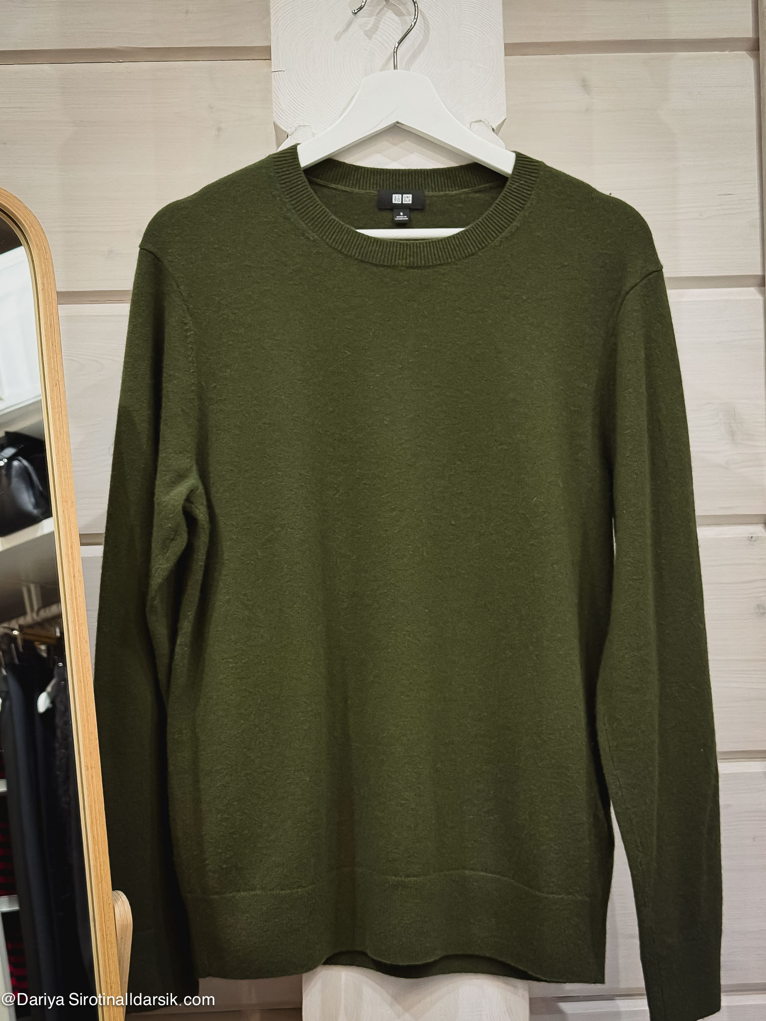 - Кашемировый джемпер Uniqlo. Можно надеть поверх футболки или рубашки, можно завязать на шее как шарф или набросить на плечи.