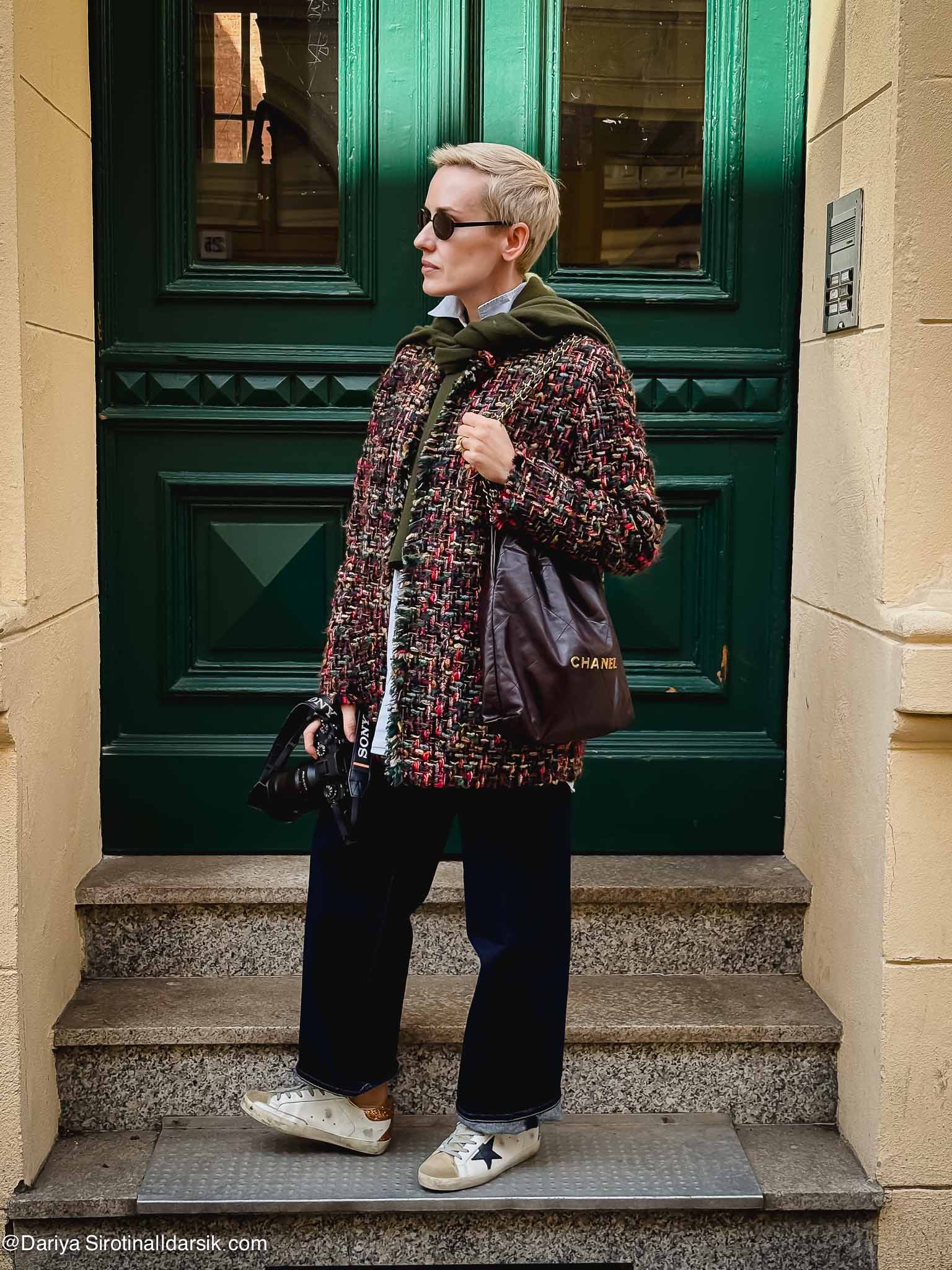 Жакет Isabel Marant, джинсы и джемпер Uniqlo, рубашка Mango, кеды Golden Goose Deluxe Brand, сумка Chanel.
