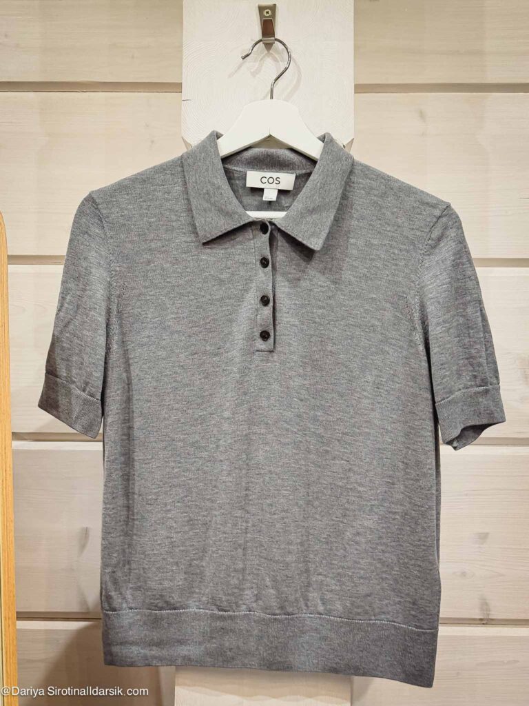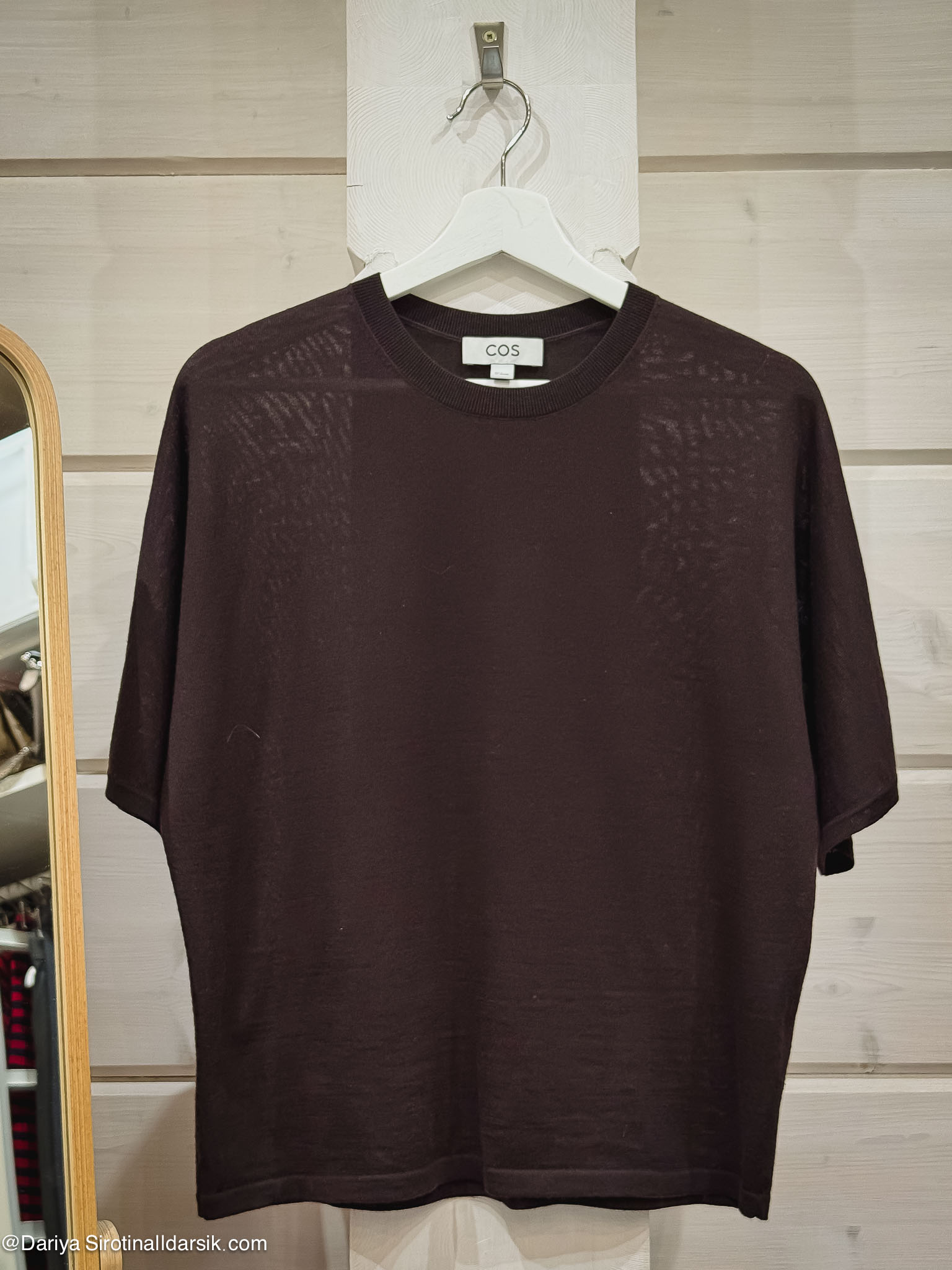- Тонкая шерстяная футболка COS. Объем, спущенная линия плеча, красивый коричневый оттенок.