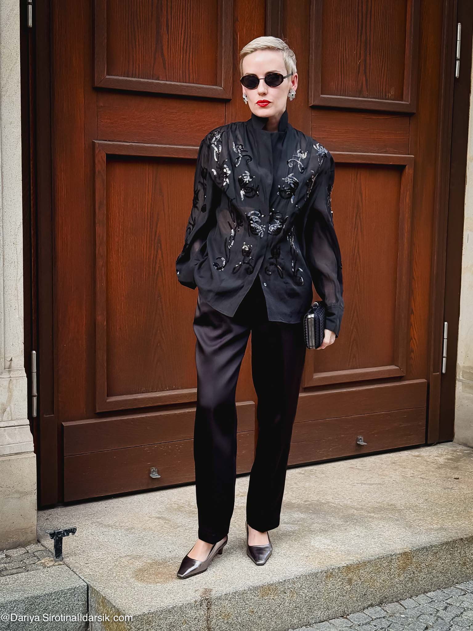 Образ, над которым я думала дольше всего: это была опера Унтер-ден-Линден. Мне было хорошо известно, что в Берлине никто никуда не наряжается, но мне хотелось одеться не повседневно, а более нарядно. Платья и брючные костюмы были отметены из-за излишней строгости. В итоге я остановилась на расшитой пайетками блузке, акцентных серьгах, серебряных туфлях и жестком атласном клатче.