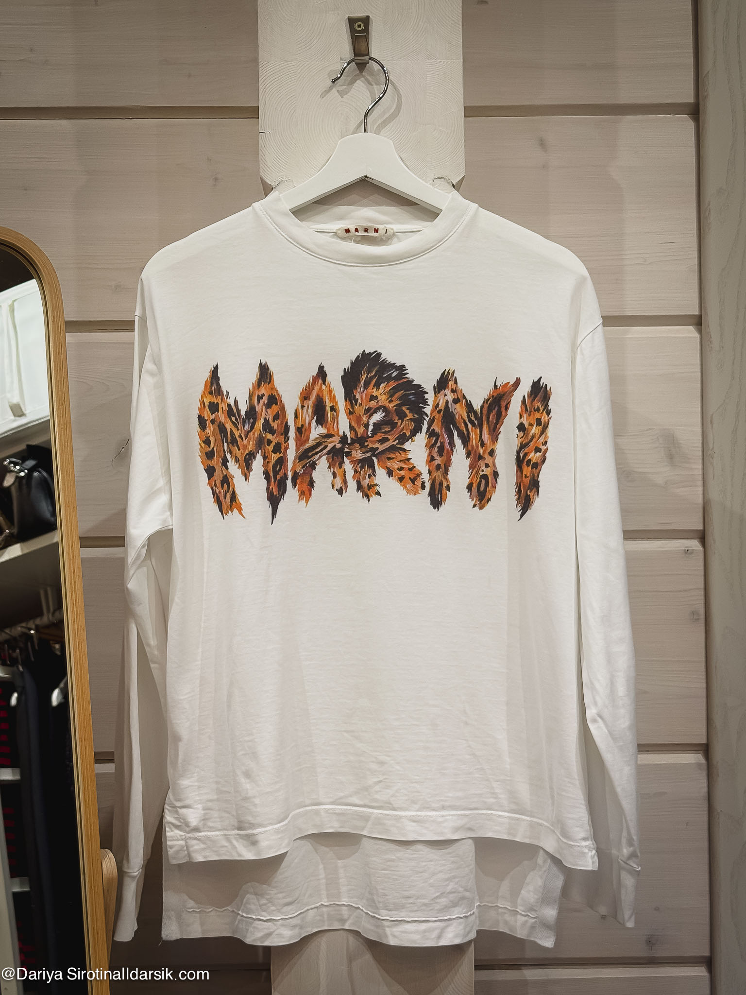 - Лонгслив Marni. Редко ношу вещи с надписями, но нежно люблю эту футболку с длинными рукавами за правильный крой (объем, длина — все по мне!) и звериный принт.