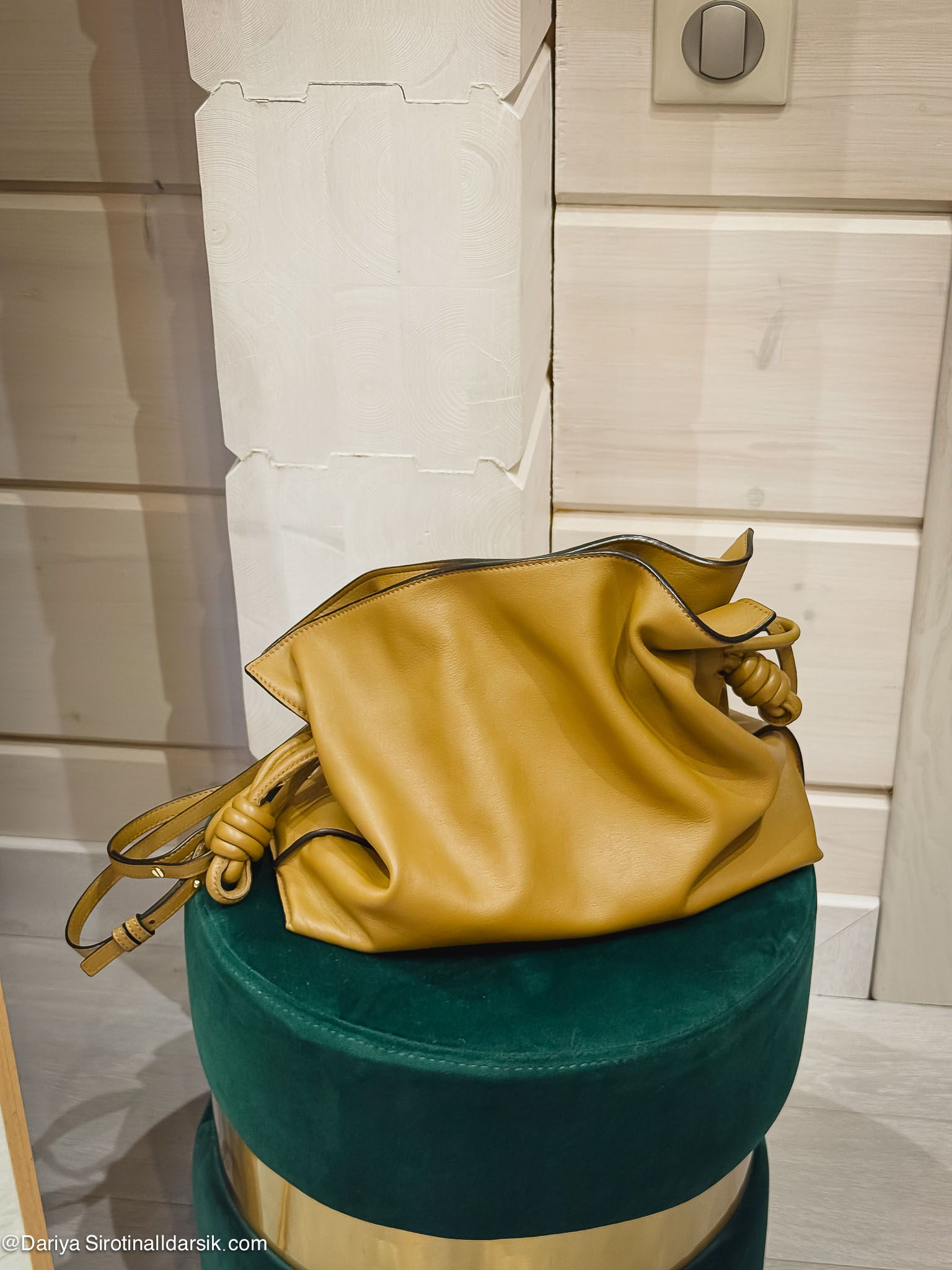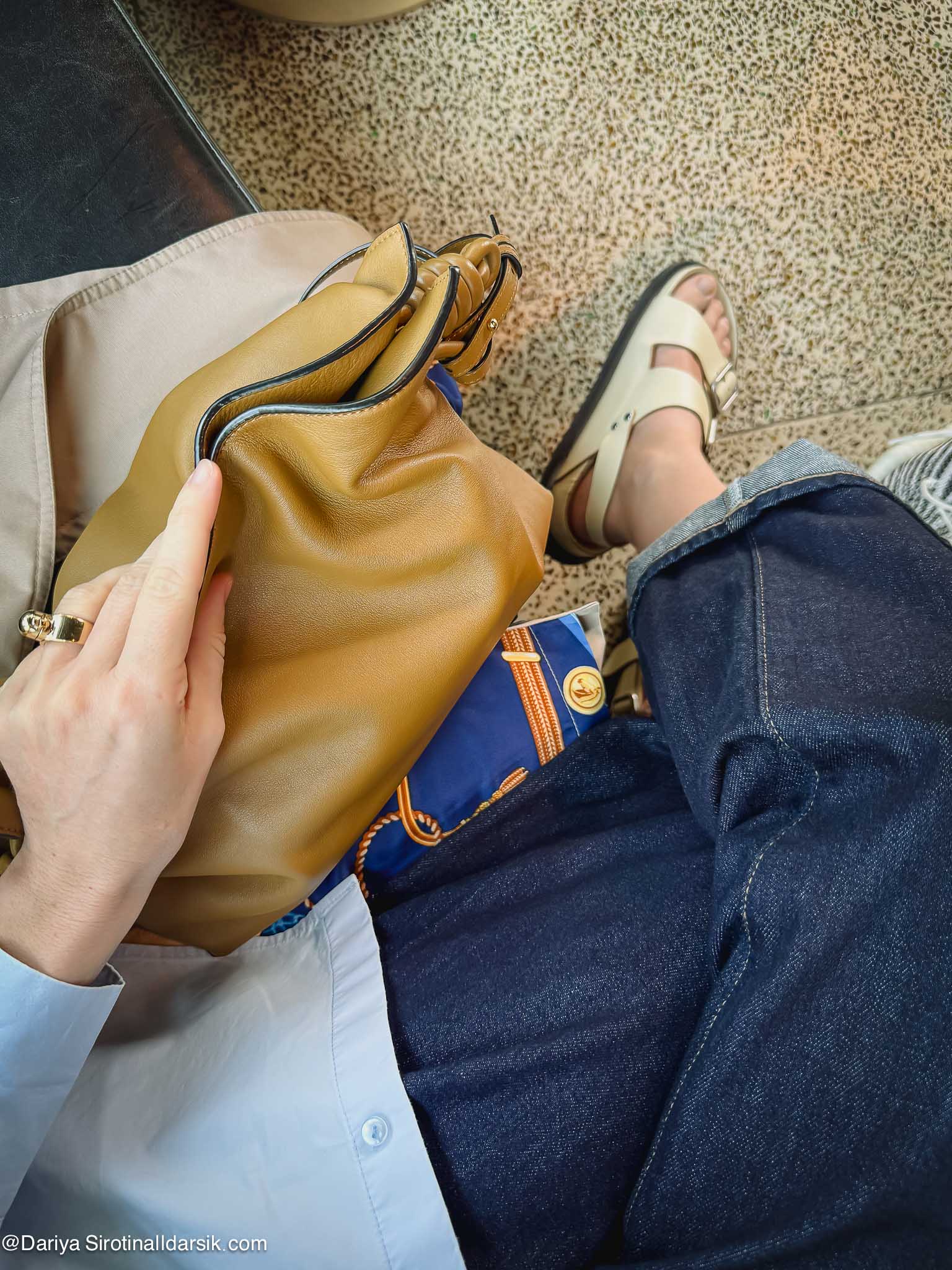- Сумка Loewe горчичного оттенка. Моя любимица, впервые почему-то взятая в поездку. Чаще всего я ношу ее как дневной клатч, под мышкой. Но ремешок позволяет ее повесить и на плечо. Оказалось, что это очень удобно.