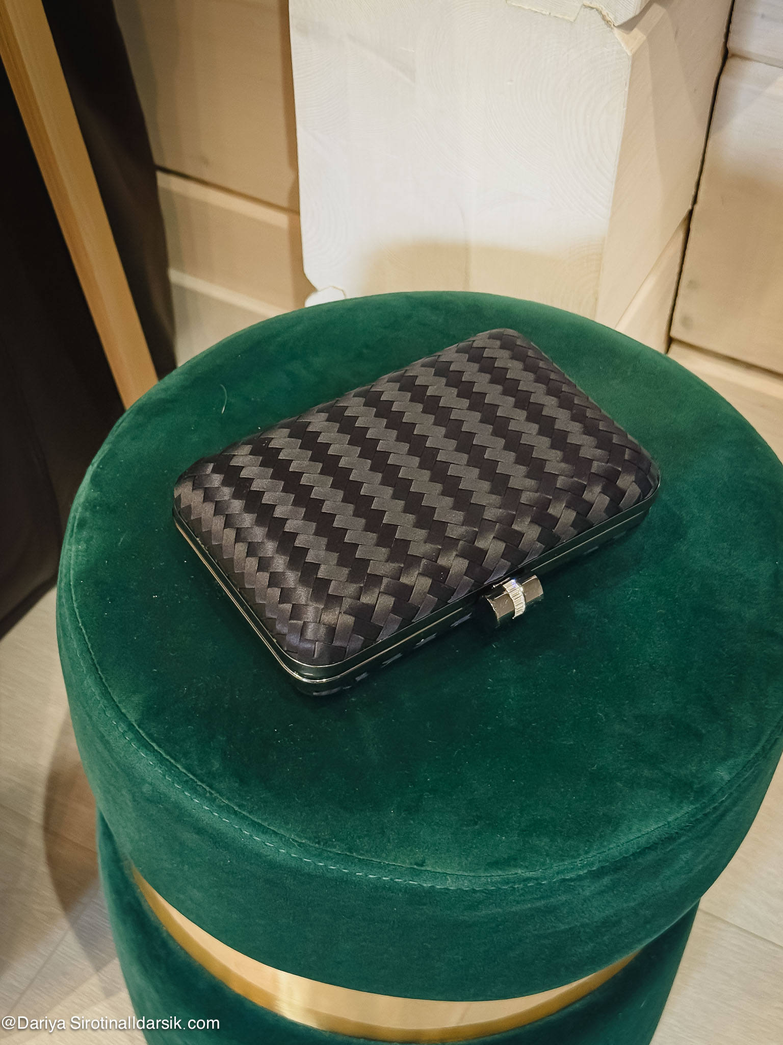 - Неизменная сардинка Bottega Veneta. Спонтанная покупка, сделанная несколько лет назад, отработавшая каждый евро. Непафосный акцент в вечерних образах, стильное дополнение для дневных. Она крохотная, в нее помещается лишь кардхолдер, телефон и помада, но бывают дни, когда этого достаточно. А на вечер больше ничего и не нужно. Длинную ручку можно завязать узлом. По-моему, это просто гениальная сумка.