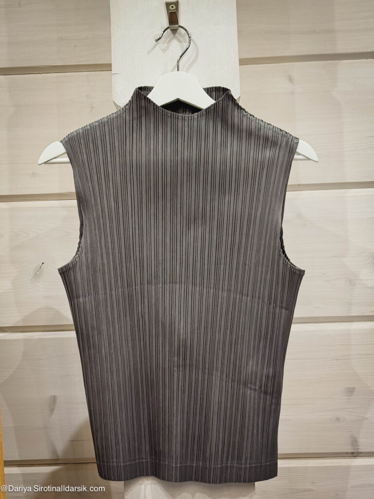 - Серая винтажная блузка Issey Miyake. Вшитый бант\палантин\платок — назовите как угодно эту часть конструкции. Нужна нарядность? Можно сделать бант. Строгость? Можно перекинуть через шею для имитации воротника-стойки. Романтичность? Оставить ленты распущенными.
