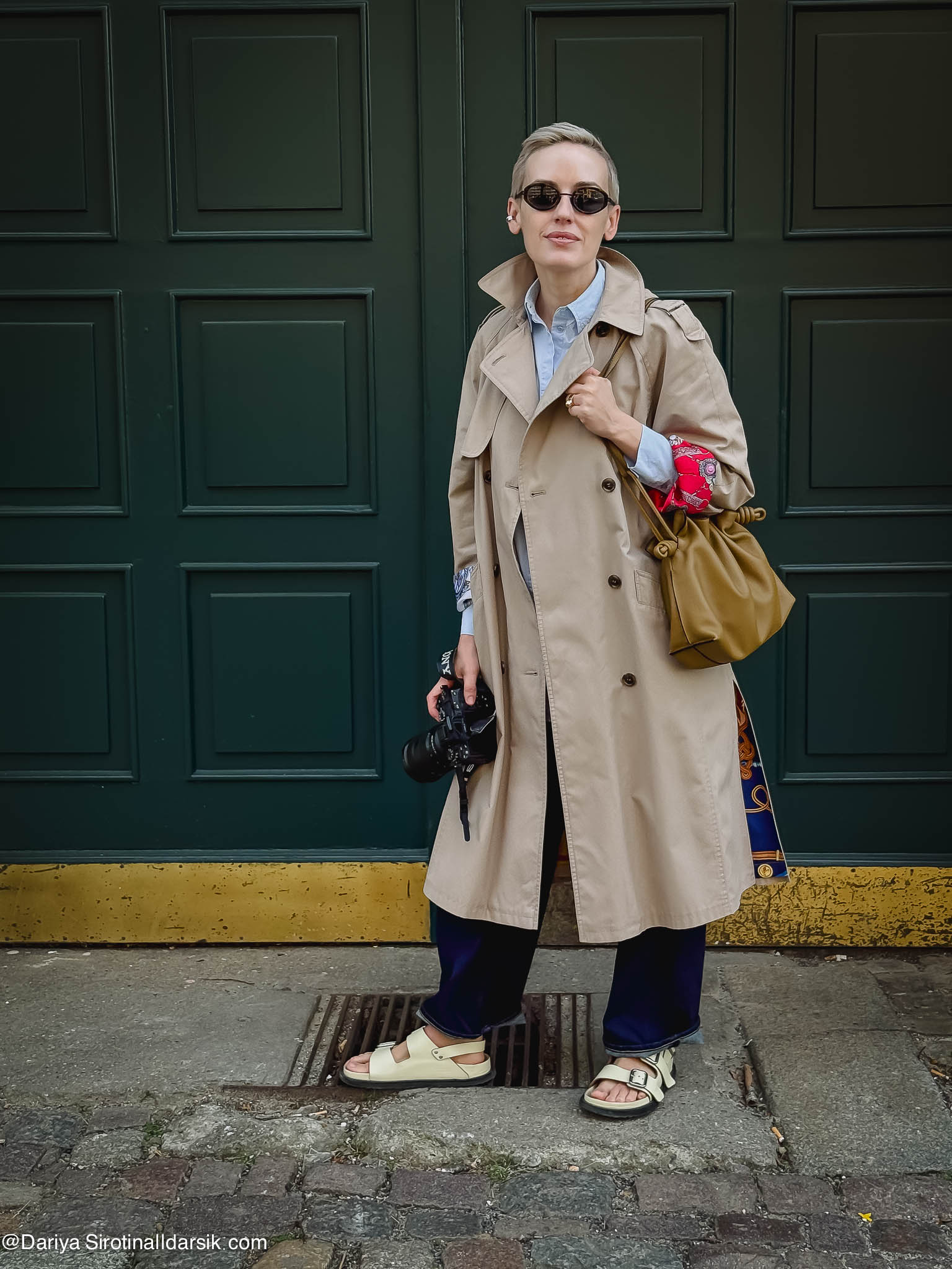 Винтажный плащ, рубашка Mango, джинсы Uniqlo, сандалии Birkenstock+Jil Sander, сумка Loewe, очки Gresso, кафф Avgust, кольцо Maison Margiela.