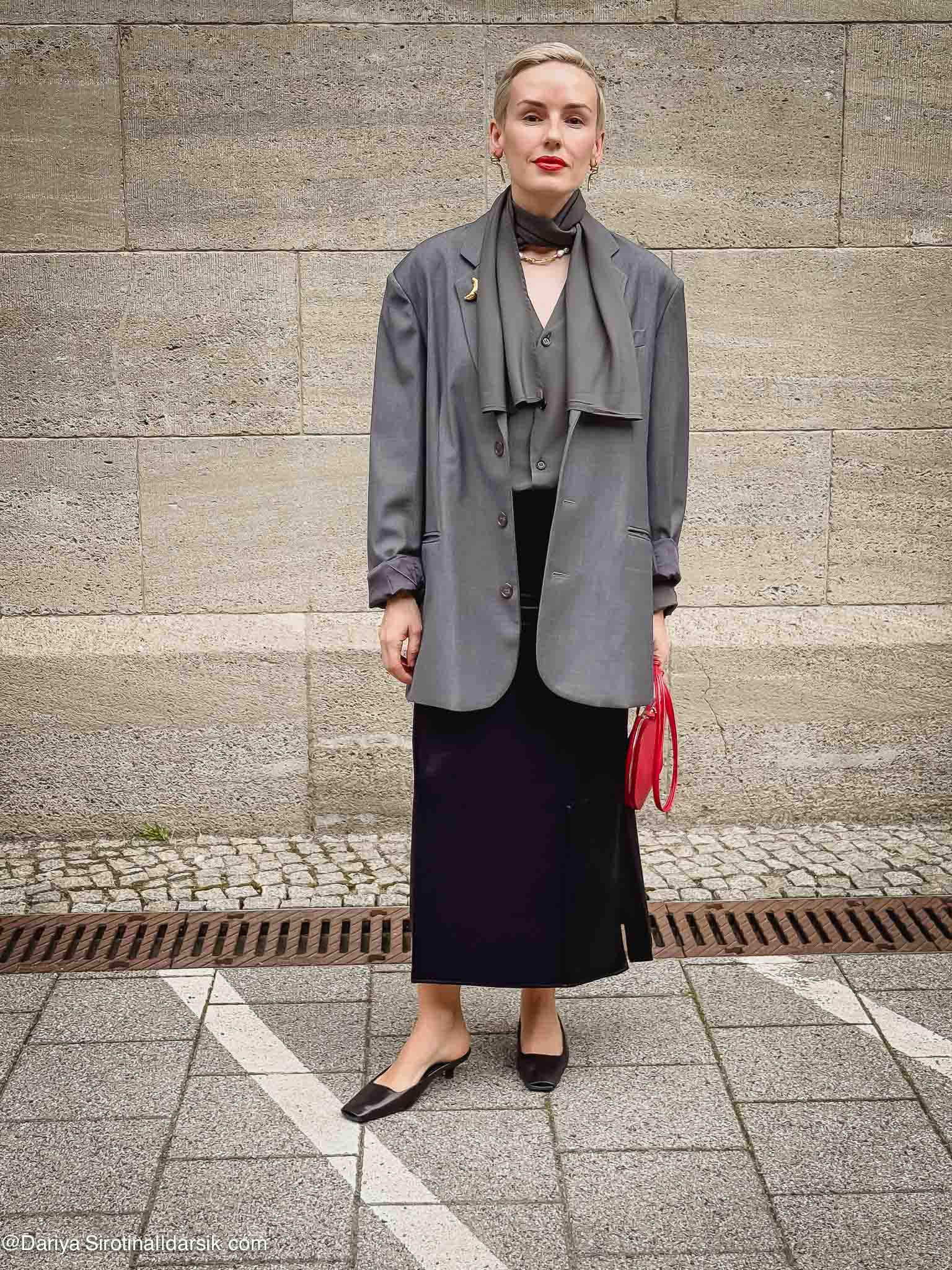 Deutsche Oper, воскресный день. Нарядно не оденешься — не тот повод, но выглядеть хочется собранно и стильно. Тут тоже много контрастов — мятая рубашка и атласные брюки, строгий жакет и игривые туфли. Оказалось, кстати, что они — фирменного цвета оперы!